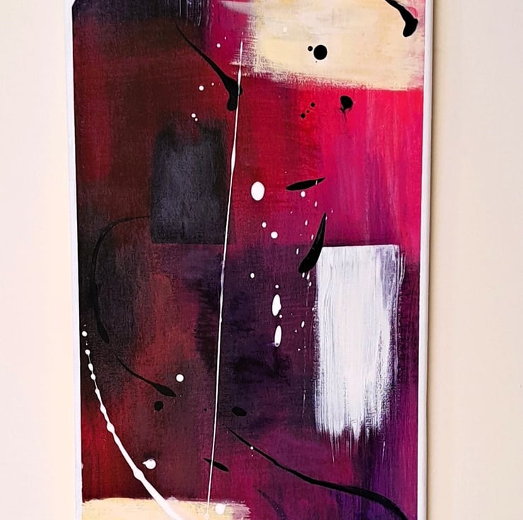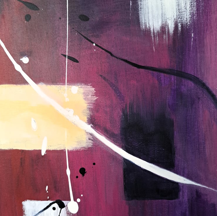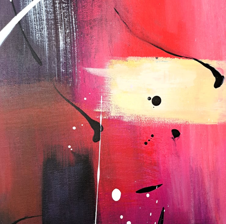 I layered and dried the paint several times, then added swirls and flicks of liquid acrylic Prussian blue and white to create more interest. I then hand painted a striking white frame around the canvas to make the colours pop which also makes the artwork appear more polished.