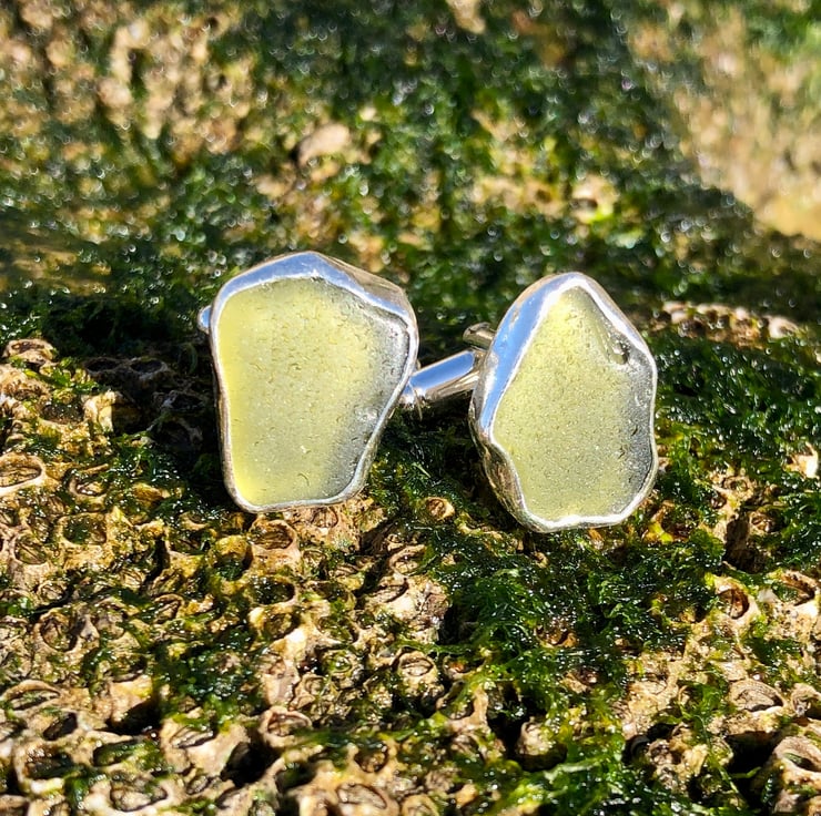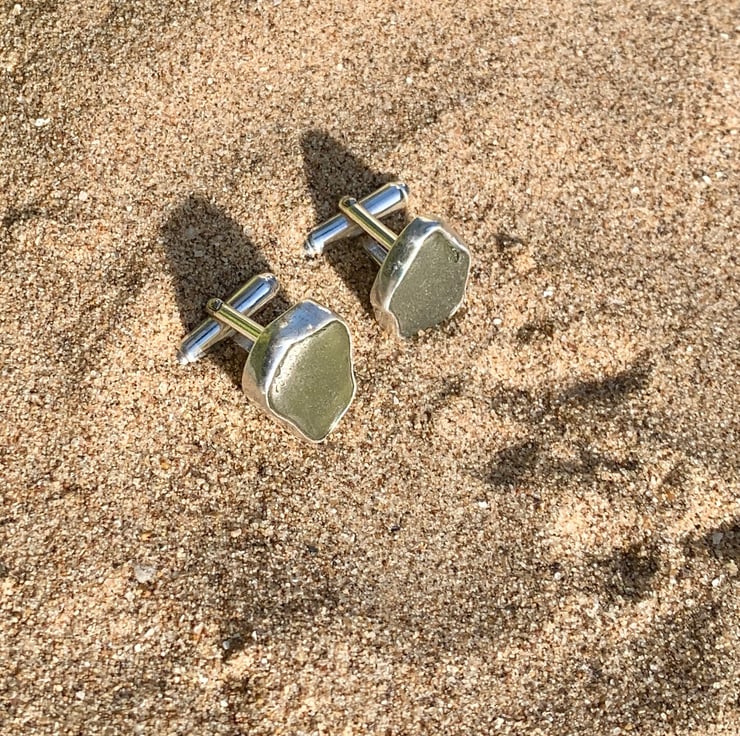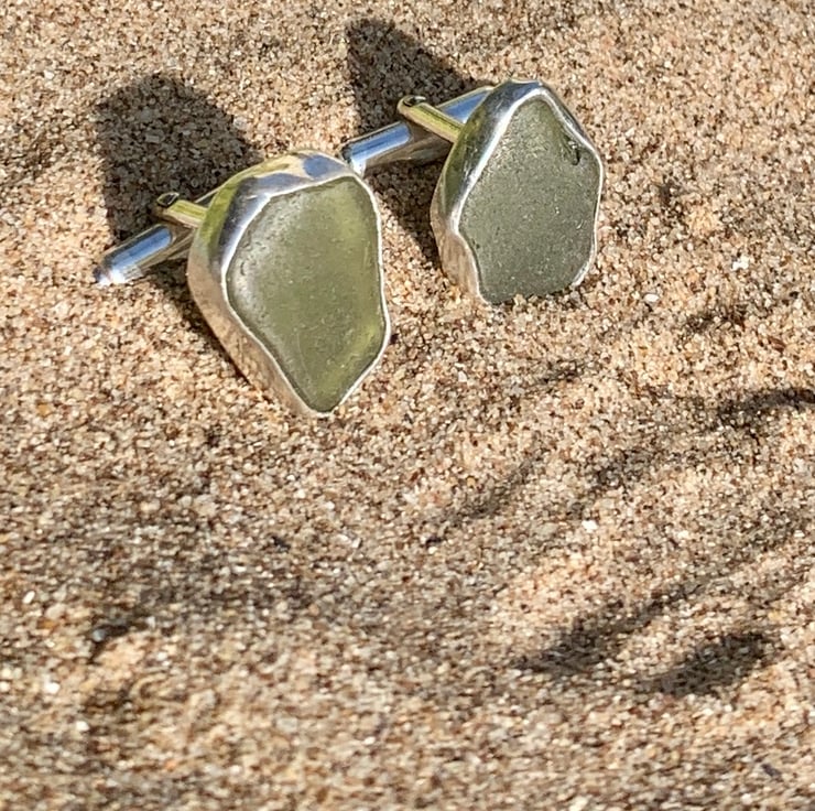 These unique cufflinks have been created using two pieces of stunning olive green sea glass which were found along the UK's South West coastline and has been set in a fine silver bezel (.999) and using sterling silver round bar U arm fittings to create a beautifully unique set of cufflinks. This piece has not been hallmarked.