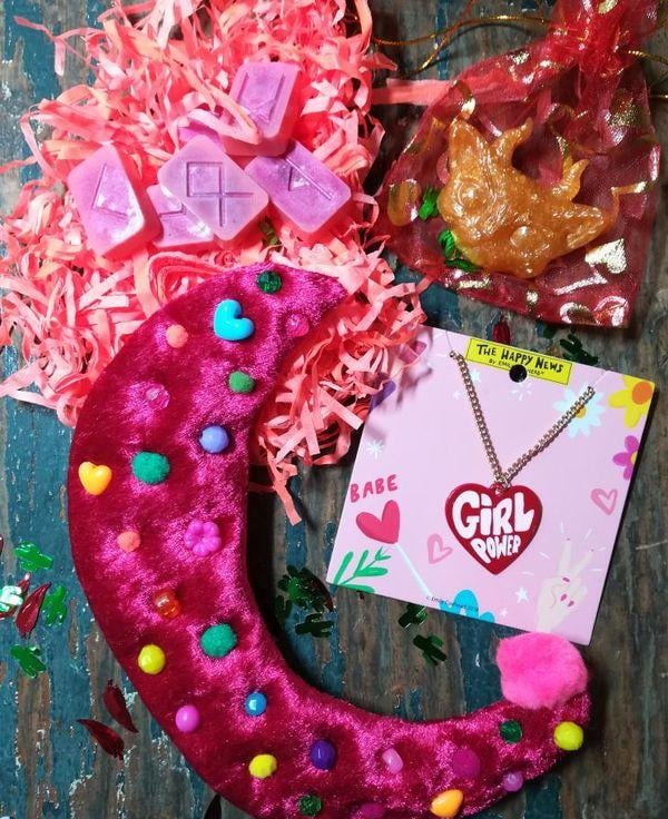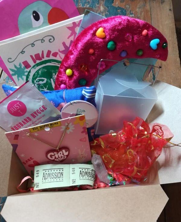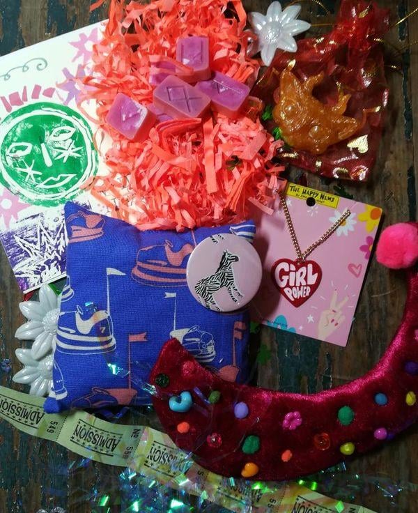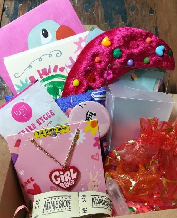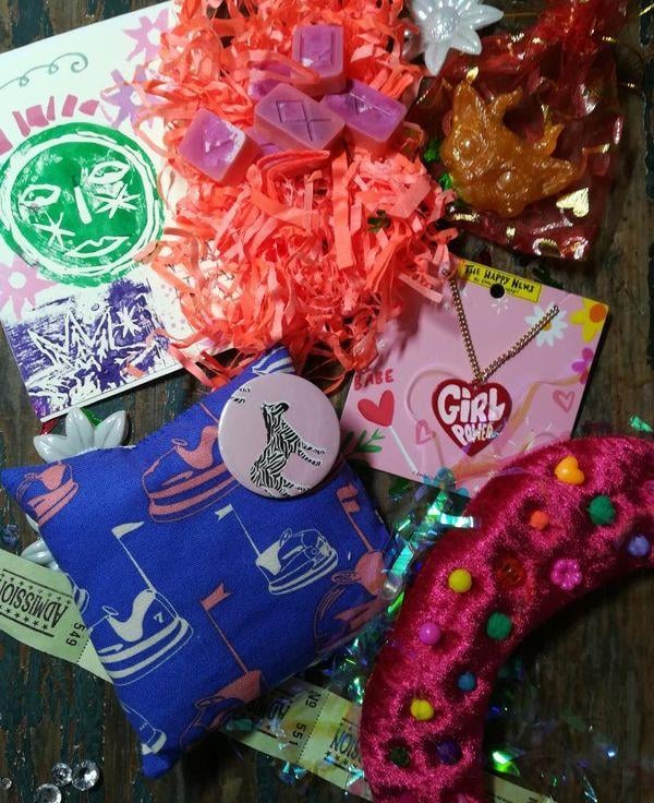 All comes with bright confetti, vintage ephemera/ tickets, pom poms, bright pink shredded tissue etc