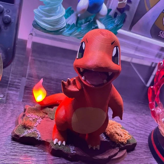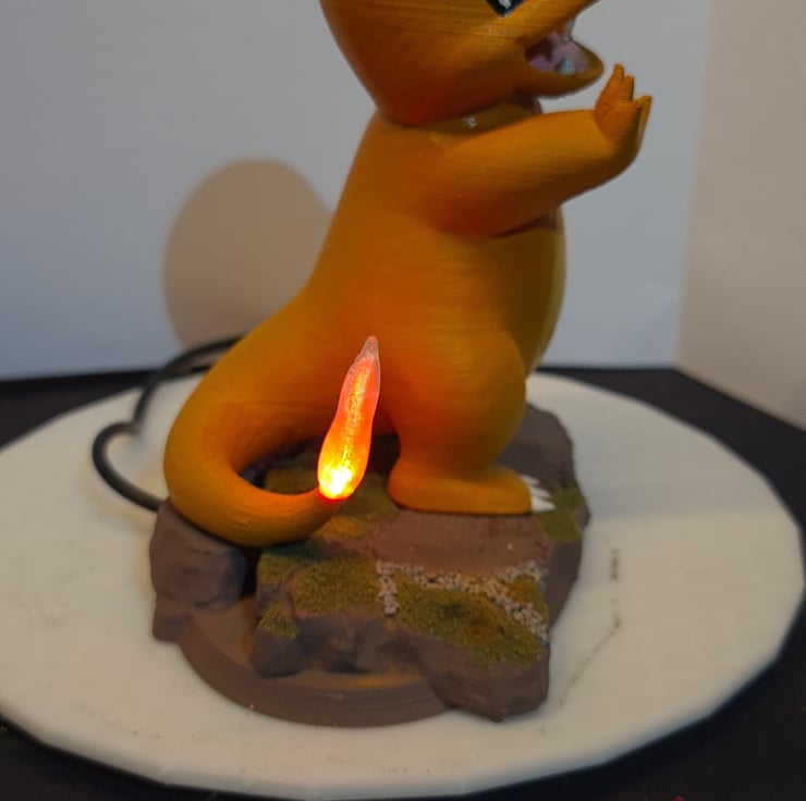 Here is a figurine inspired by Charmander. This little guy stands 11cm tall and has an led tail that simulates the flickering of a flame achieved by custom code loaded onto a circuit board bedded within the base. The stand has grass effect added to it along with simulated bush and gravel. He runs from 5v USB power which can be supplied from computer/laptop USB port, USB hub, USB wall plug (not included) or other USB port that supplies 5v. It also has a 30cm fixed cable. overall dimensions 120mm wide x 70mm deep x 110mm tall. The lead time from ordering to dispatch is 2 week. Please note, each one is hand made to order so actual item may vary slightly from the pictures shown.