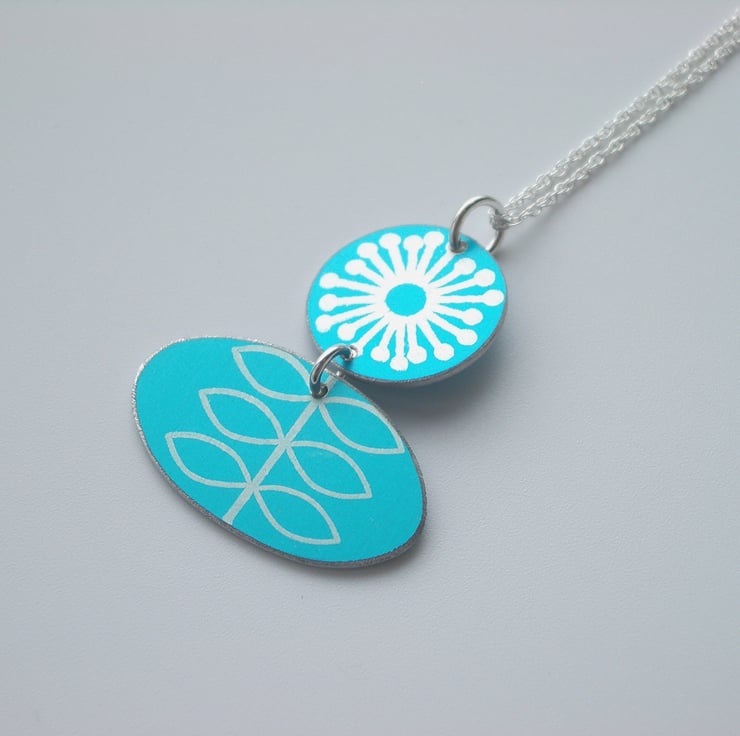 This flower necklace is inspired by folk art and is made from aluminium that I have dyed and printed with a scandi style flower and leaf motif in turquoise.