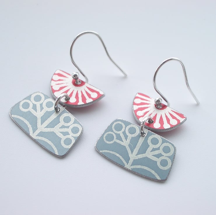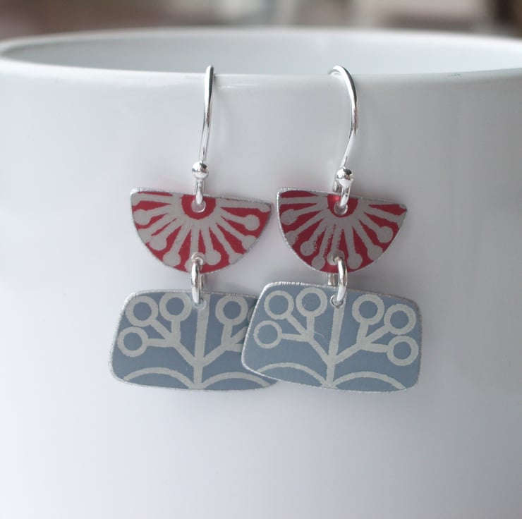 These mid century style earrings are made from anodised aluminium which I have dyed in red and grey and printed with a starburst and berry design. I hand cut the rectangle and semi circle shapes by hand using a jeweller's piercing saw and file the edges to give a nice smooth finish. They dangle from sterling silver jump rings and hang from sterling silver ear hooks. The earrings measure approximately 20mm x 20mm.