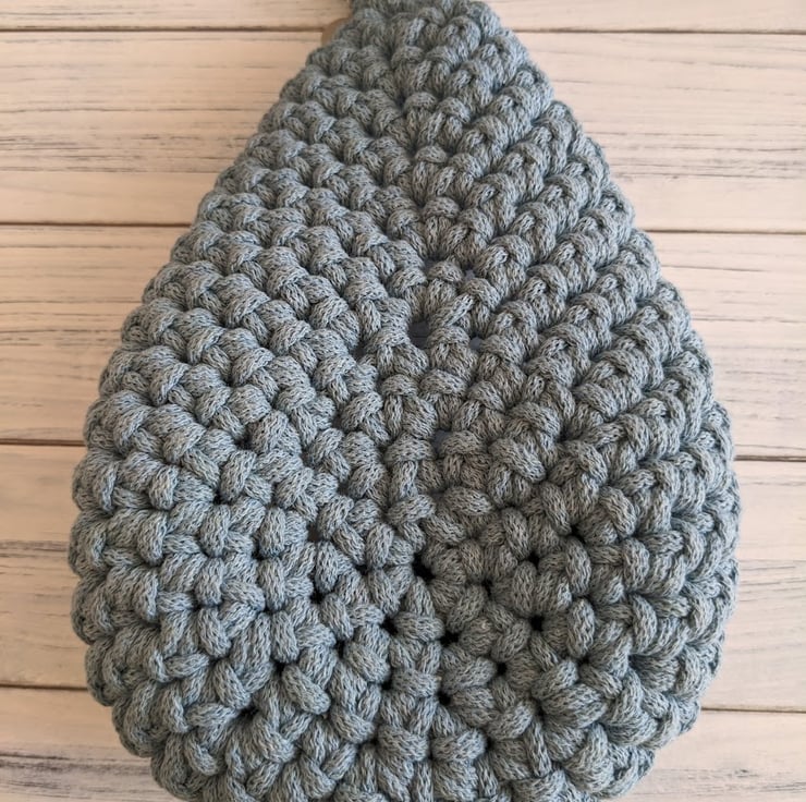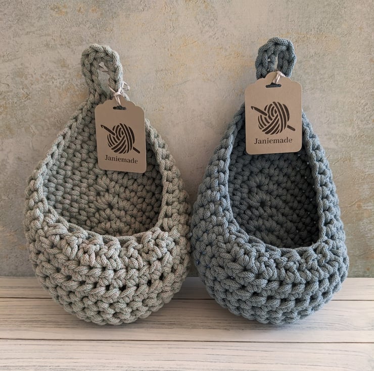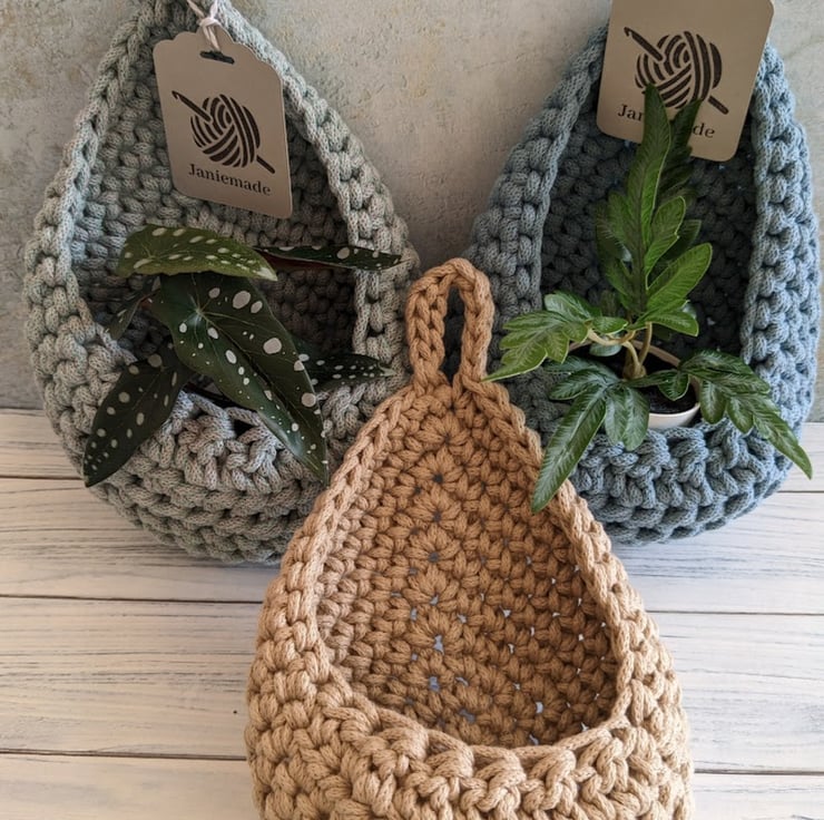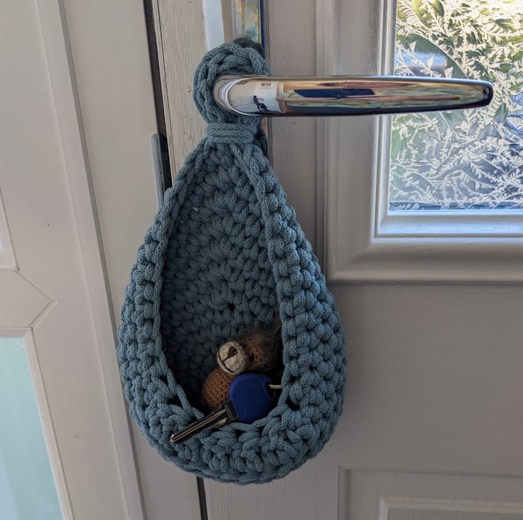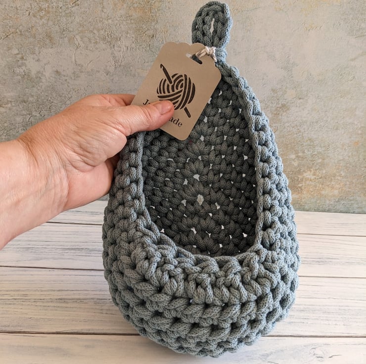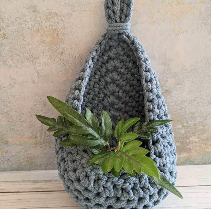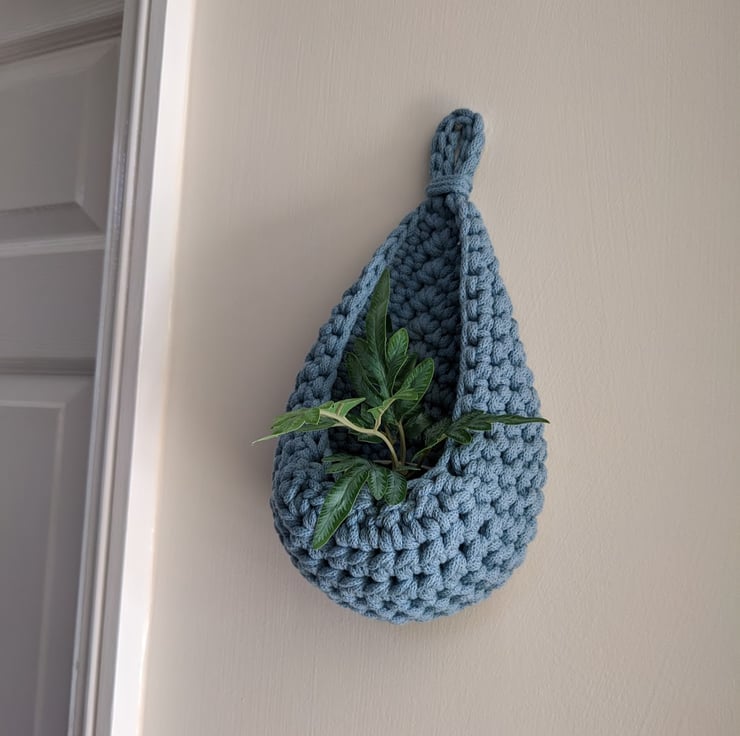 A small hanging basket in a raindrop / teardrop shape that lies flat against the wall. It hangs from an integral crocheted loop.