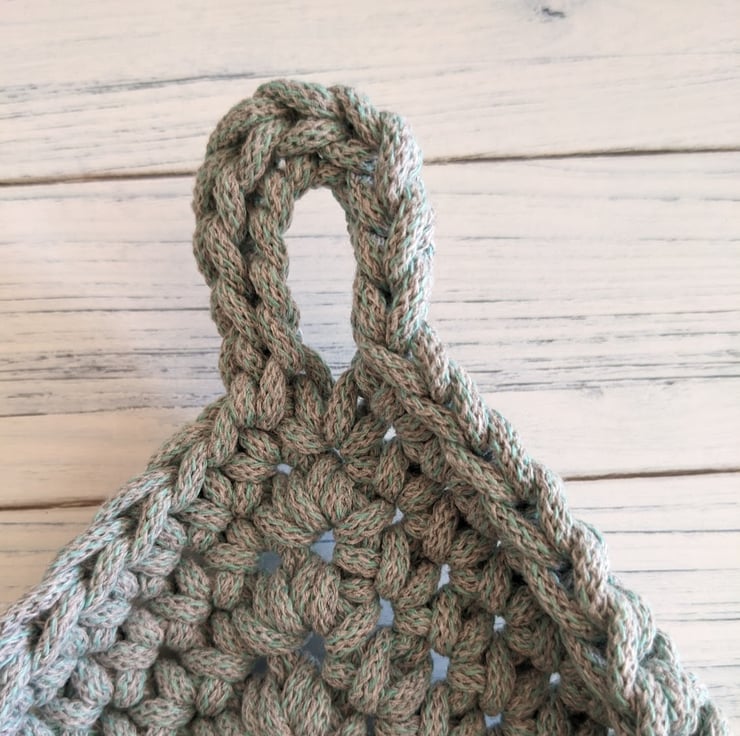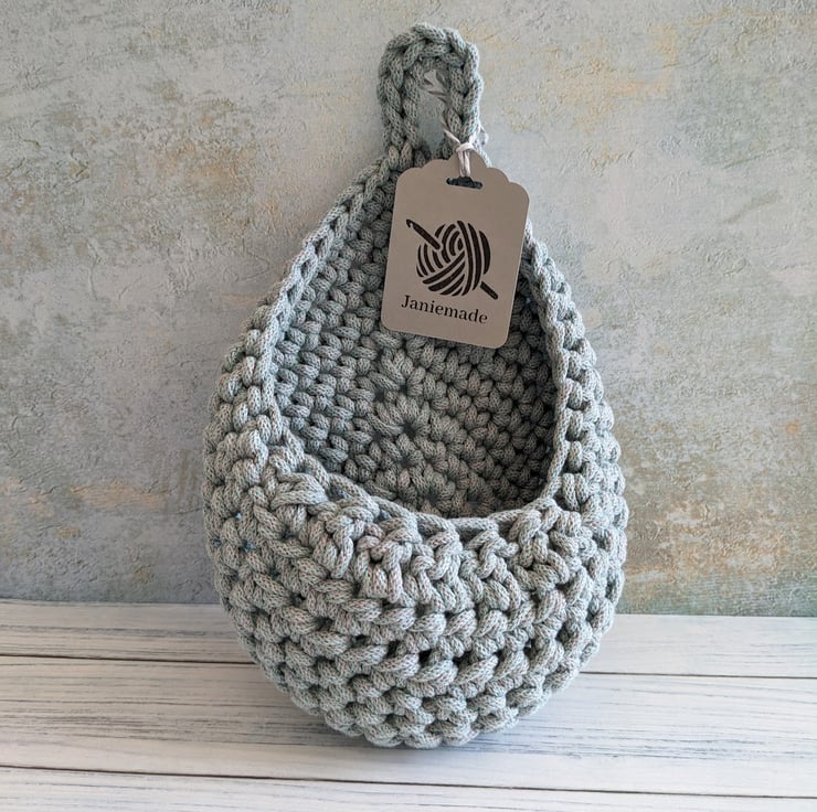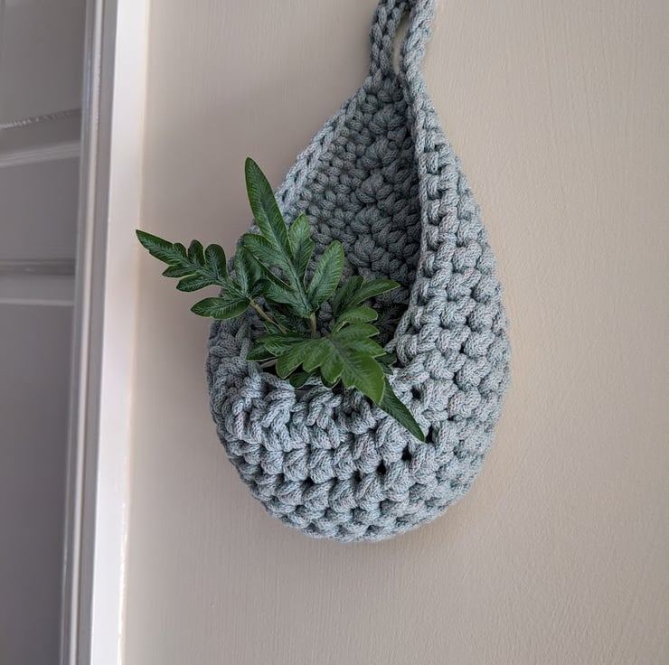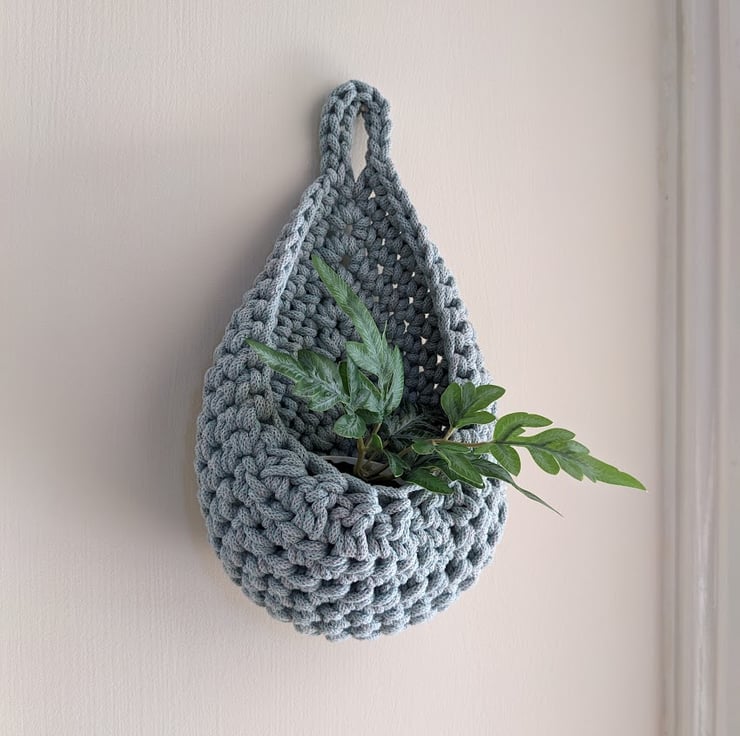 A small hanging basket in a raindrop / teardrop shape that lies flat against the wall. It hangs from an integral crocheted loop.