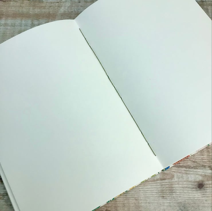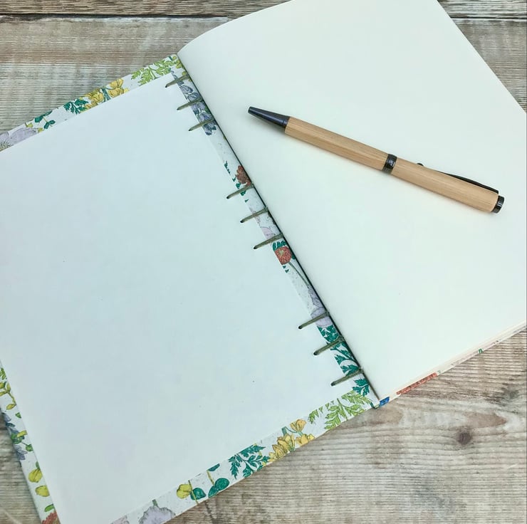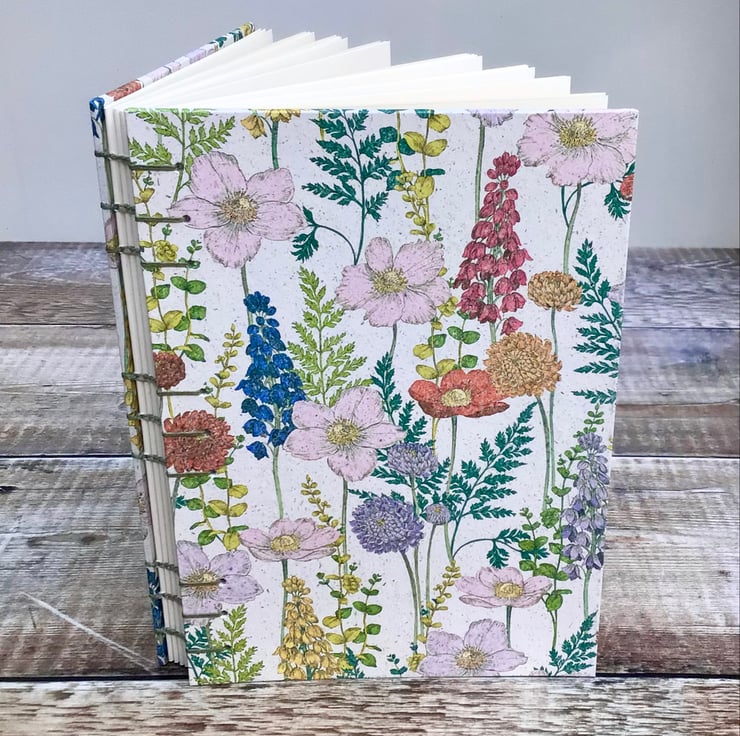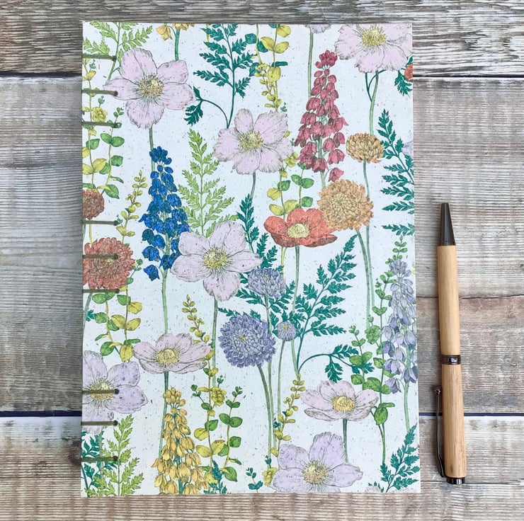 This A5 journal notebook is covered with a beautiful grass paper depicting summer garden flowers and filled with blank 120gsm ivory paper. It is perfect for journaling and sketching or as a notebook, planner, diary, wellness and gratitude journal.