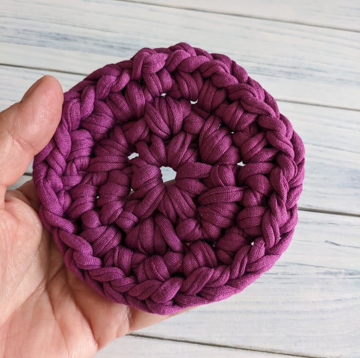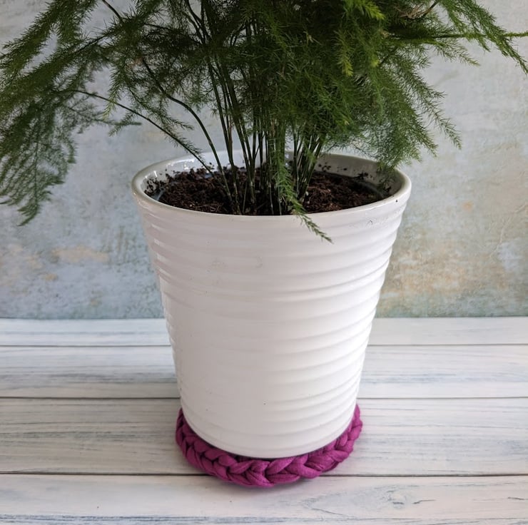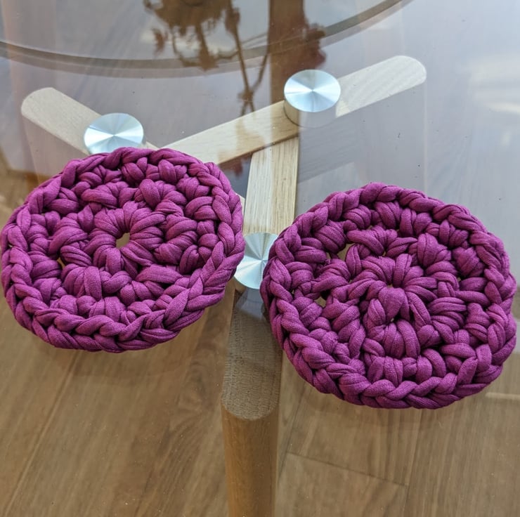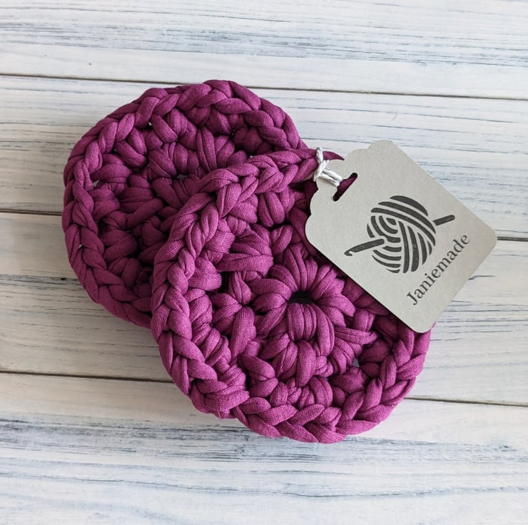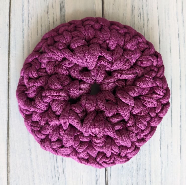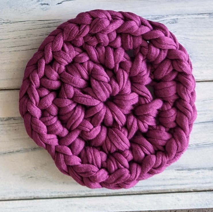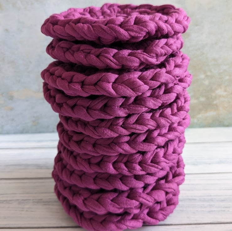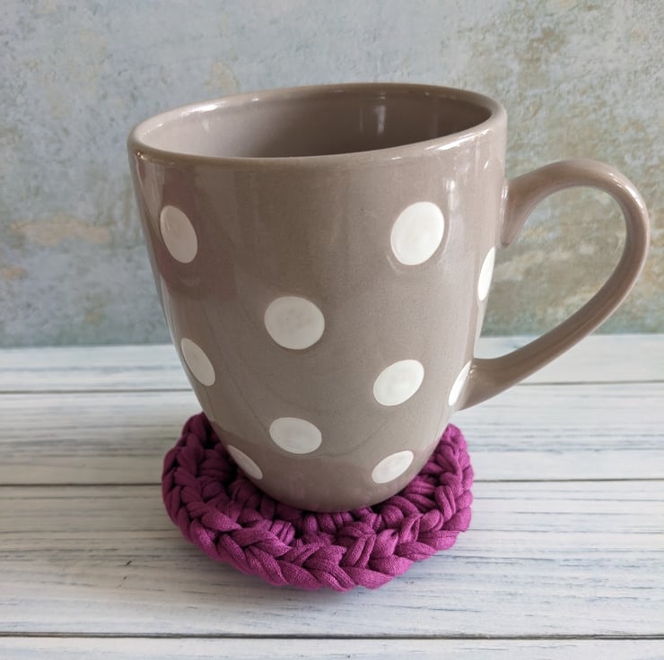The T-shirt yarn gives great definition to the crochet stitches and makes a nice, thick coaster that will protect surfaces from hot drinks. Items made from T-shirt yarn are all one-offs, the yarn thickness is variable and because shades are created by blending recycled fabric, each colour batch also varies. I can't make more coasters in future that will be the same as these gorgeous deep dark pink ones, once they're gone, they're gone!