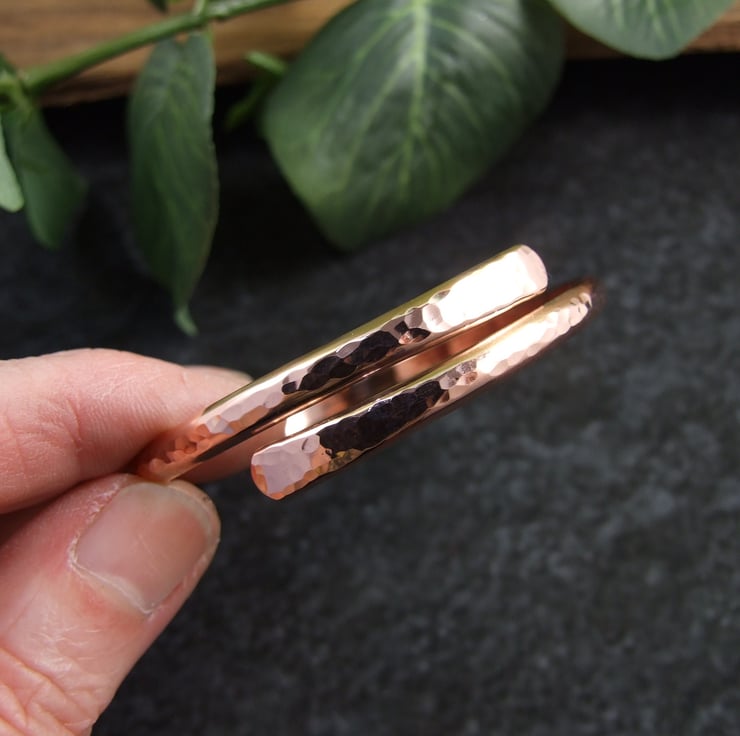 Copper Bangle 5mm wide copper wire bangle in overlap design with bright hammered finish.. Medium fit to suit 6-7 inch wrist.