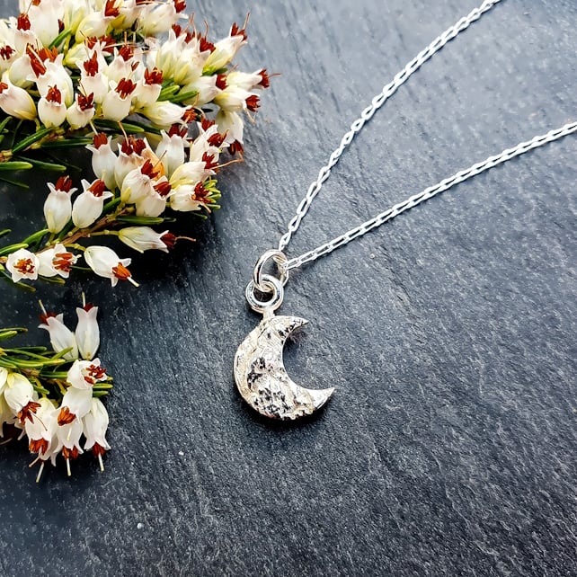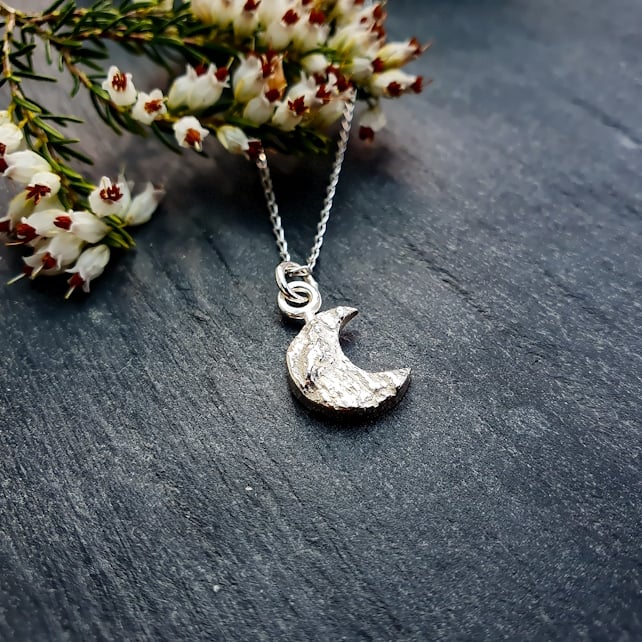 This dainty crescent moon pendant has been handmade in recycled fine (99.99%) silver.