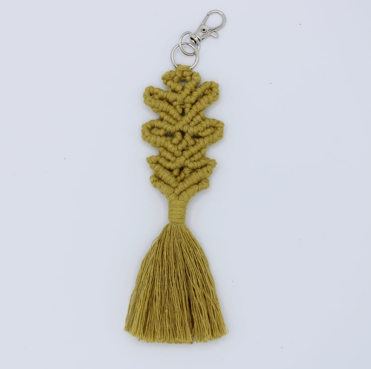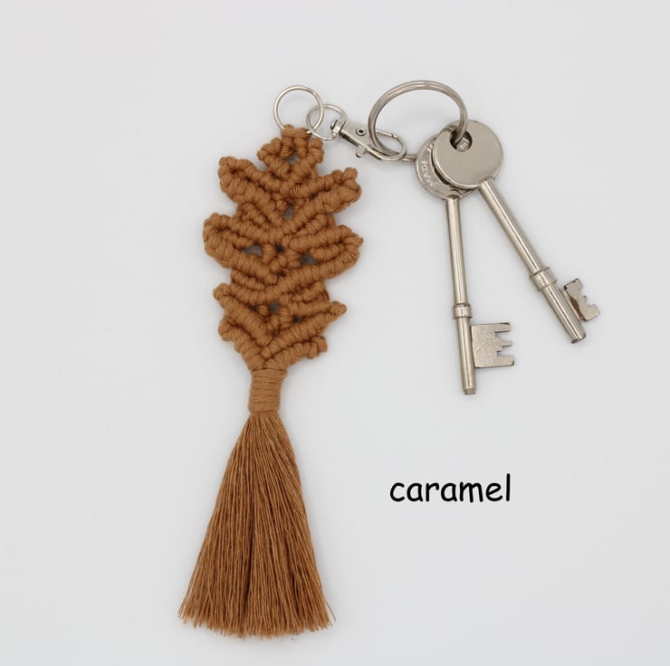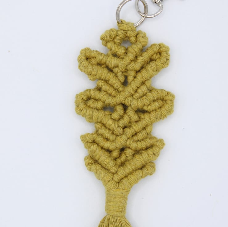 The oak leaf itself is 7cm long with the wrap and tassels are adding a further 7cm. It is 4.5cm across the widest part. The leaf is tied to a 1cm ring and a 3cm swivel clasp attached. The tassels at the bottom have been brushed out for a softer finish.