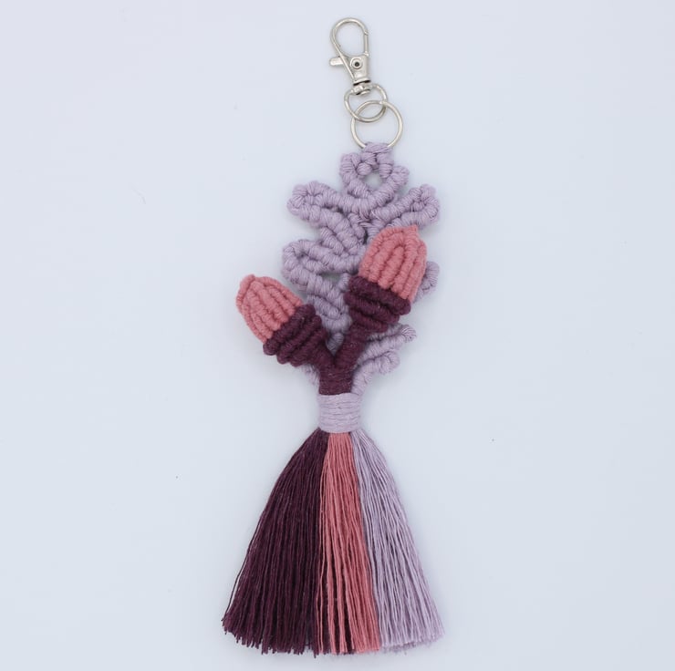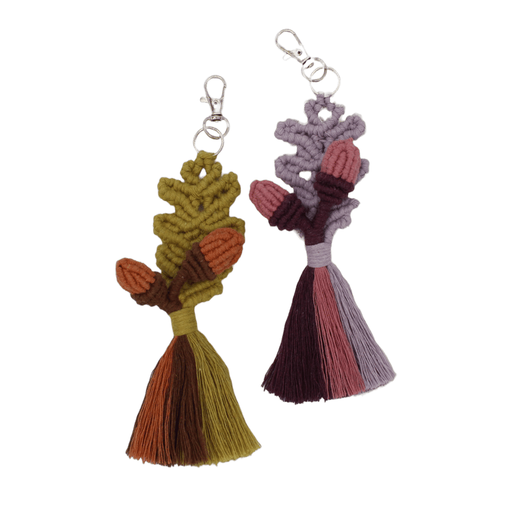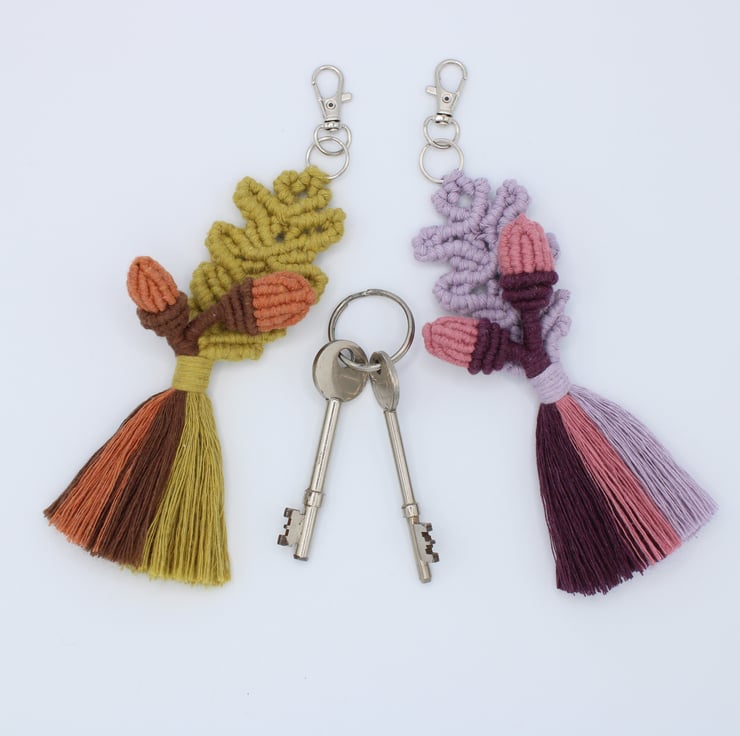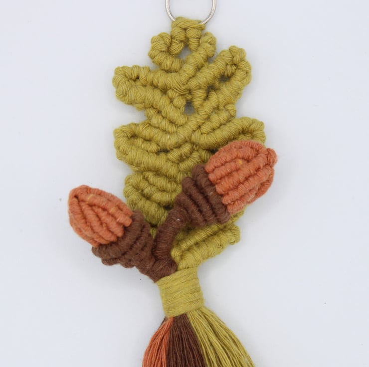A macrame keyring in the shaped of an oak leaf with 2 acorns which has been hand knotted to my own original design.