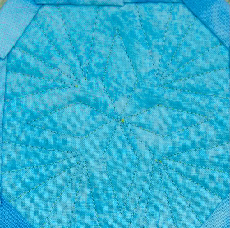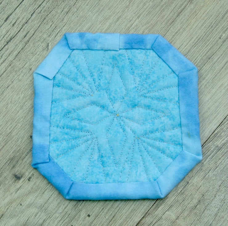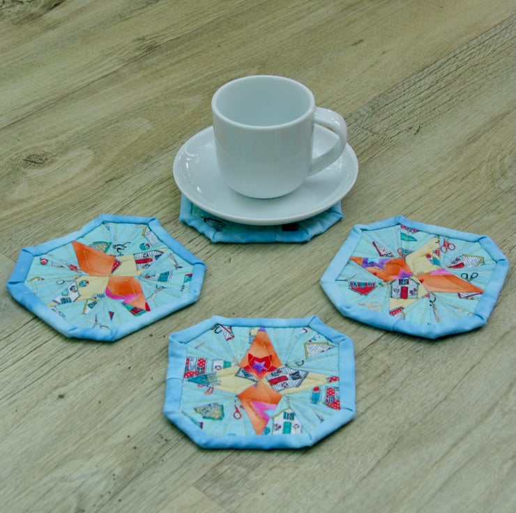 All the cotton used is high quality quilting cotton. The coasters are quilted with a kite shape over the centre 4 point star and lines to follow the shape of the surrounding triangles.