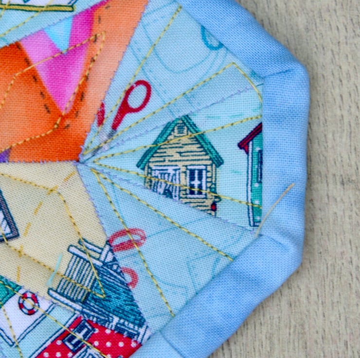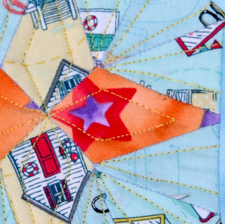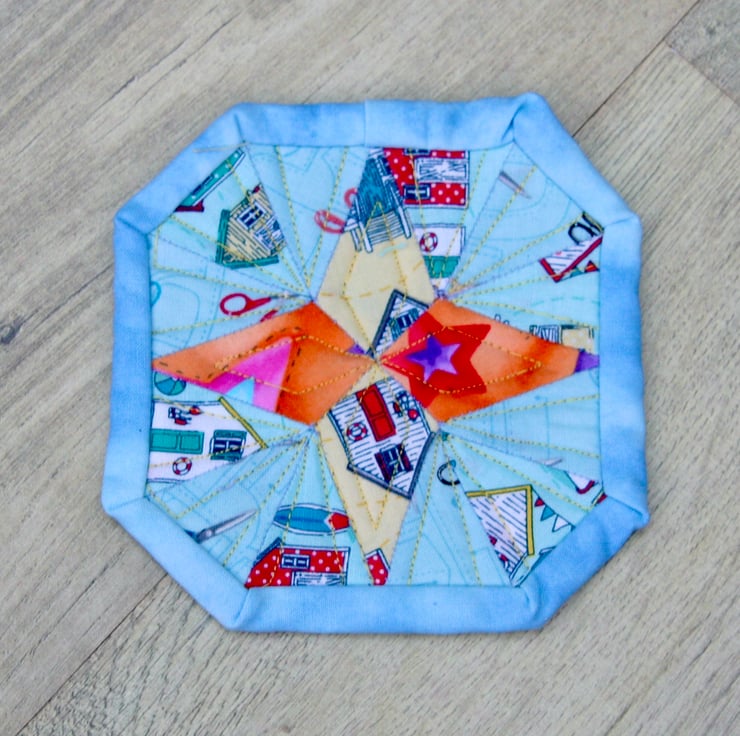 The front of the coasters are hand sewn using the English Paper Piecing (EPP) technique using scraps of fabric featuring beach huts and stars. There is a centre star of orange and yellow fabrics and 3 triangles in each corner, pointing into the star. They are quilted with an ecofriendly polyester wadding, made from recycled plastic bottles and are backed and bound with a light blue fabric.