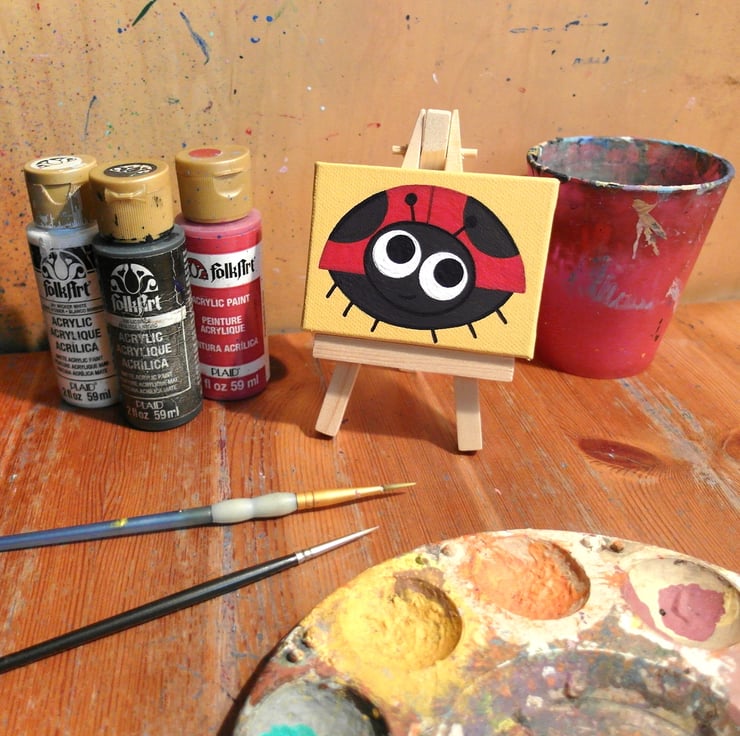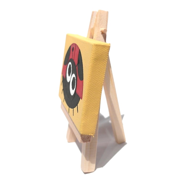 The cartoon ladybird is painted in acrylics on a small 6cm x 8cm (2.4" x 3.2") canvas, and is signed and dated on the back.