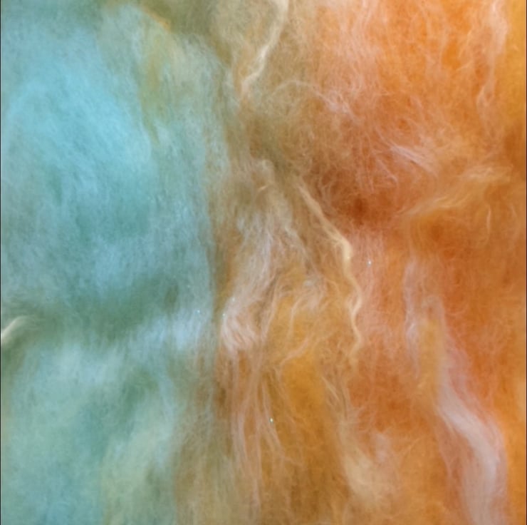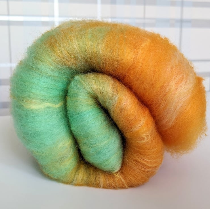 Juice is a carded batt, made with hand dyed British Wool. Bright orange and aqua marine, juicy and summery.