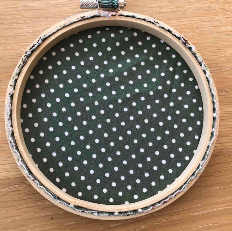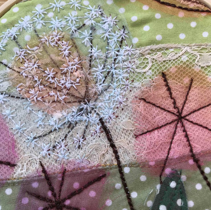 In a 5.5 inch bamboo embroidery hoop. A textile picture using printed polka dot cotton, organza and vintage lace. Machine embroidery.