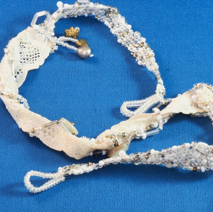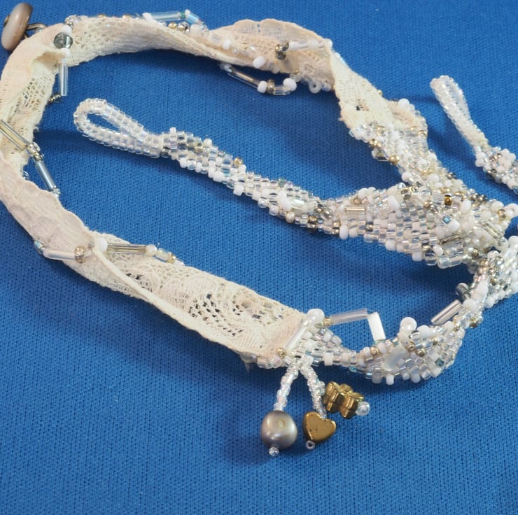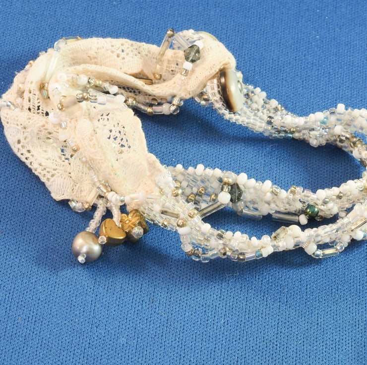The lace is a ream colour with a pattern of flowers, beads are stitched along both edges and then wound in strands around the lace. To make the fastener, and finish the bracelet, brick stitch bead weaving is added to each end, finishing with a small loop of beads. The bracelet is wound around and the loops fasten round two old mother of pearl shoe buttons.