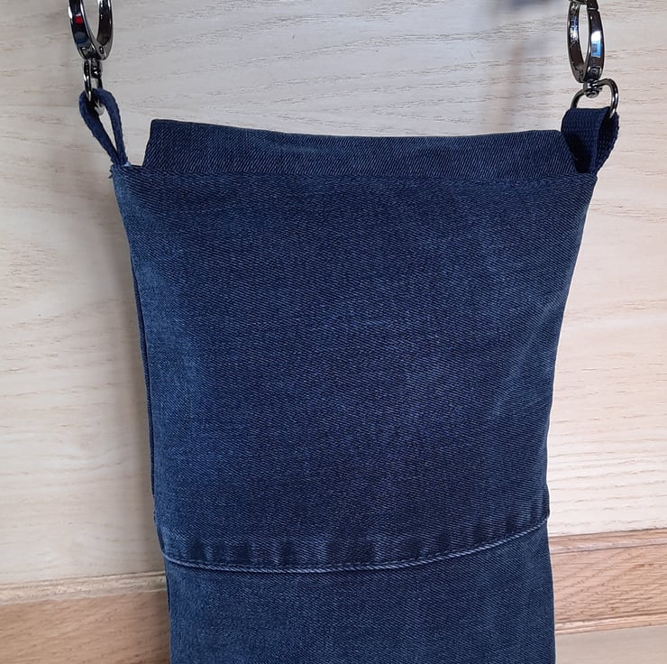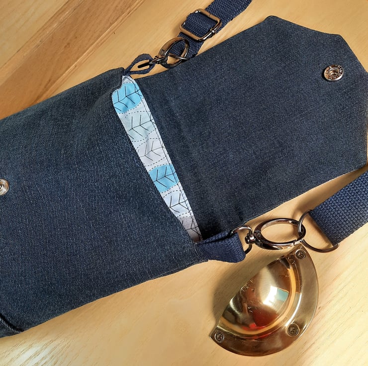 This dark-blue repurposed denim crossbody bag has been designed with an adjustable strap and complimentary pale-blues, ash grey and white cotton lining. It is finished with gunmetal grey swivel lobster clasps.