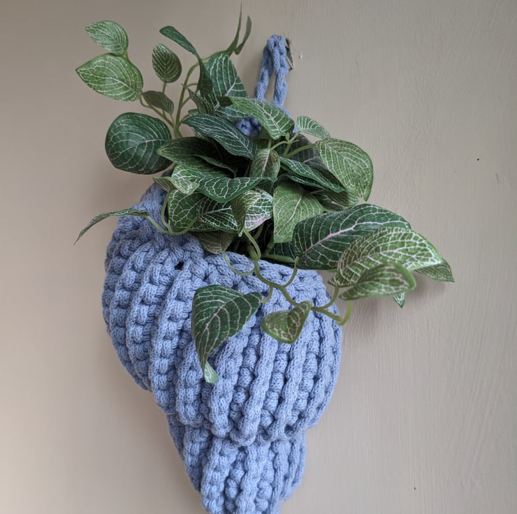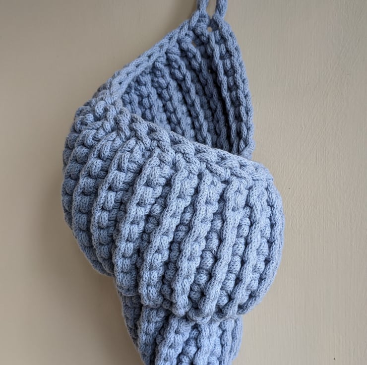 A beautifully tactile large crocheted shell, made with a premium recycled 100% cotton braided cord. The shell is flexible yet keeps its shape and the cord gives great definition to the crochet stitches used to create it. Made in the new shade of cord, 'Iris,' it is a lovely soft pale blue-violet colour (hard to capture in a photo).