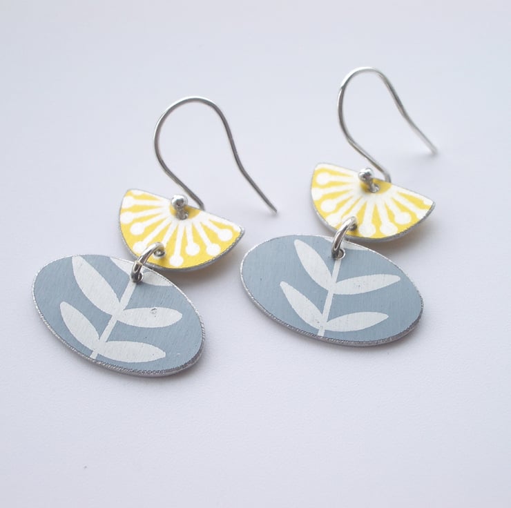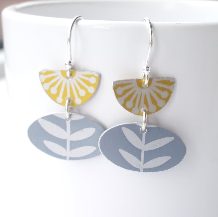 These tulip shaped folk art style flower and leaf earrings are made from anodised aluminium which I have dyed in yellow and grey and printed with a leaf print. The dye is made permanent by heating the aluminium. I have cut out the semi-circle and pod shape with a piercing saw and filed the edges for a nice smooth finish. The two pieces are linked with a sterling silver hoop and dangle from a sterling silver ear wire. The semi-circle and pod shape together both measure approximately 25mm from top to bottom and the widest part of the pod measures 20mm across
