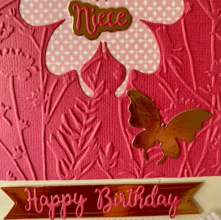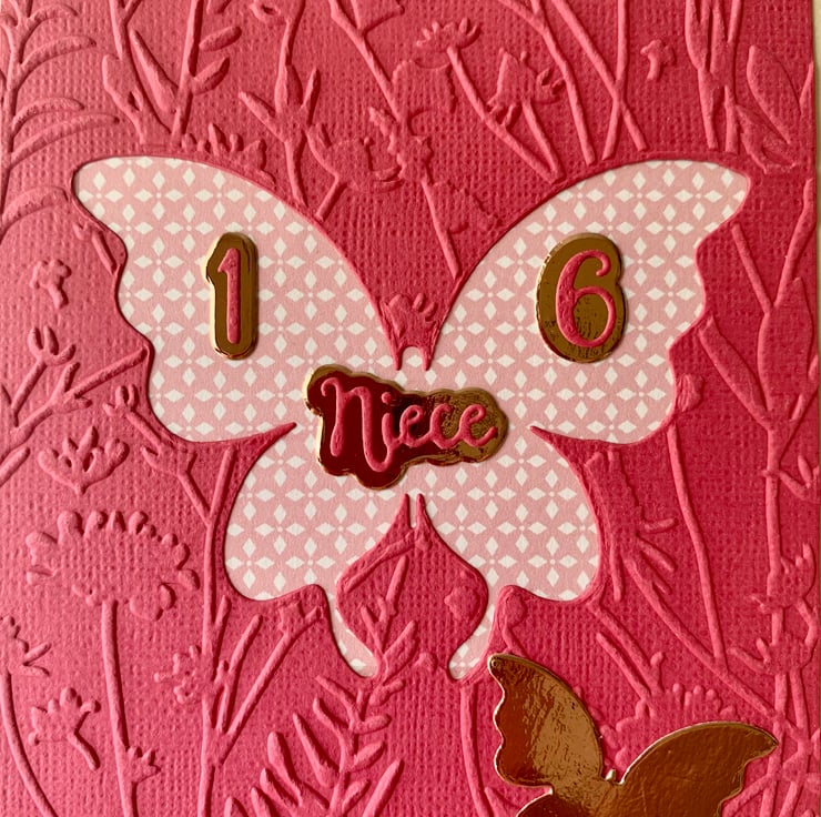 Made using embossing and die cutting techniques, the stunning embossed floral pattern is set against a pretty pink and white pattern, with a rose gold butterfly adding some extra glamour.