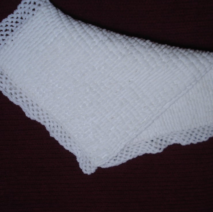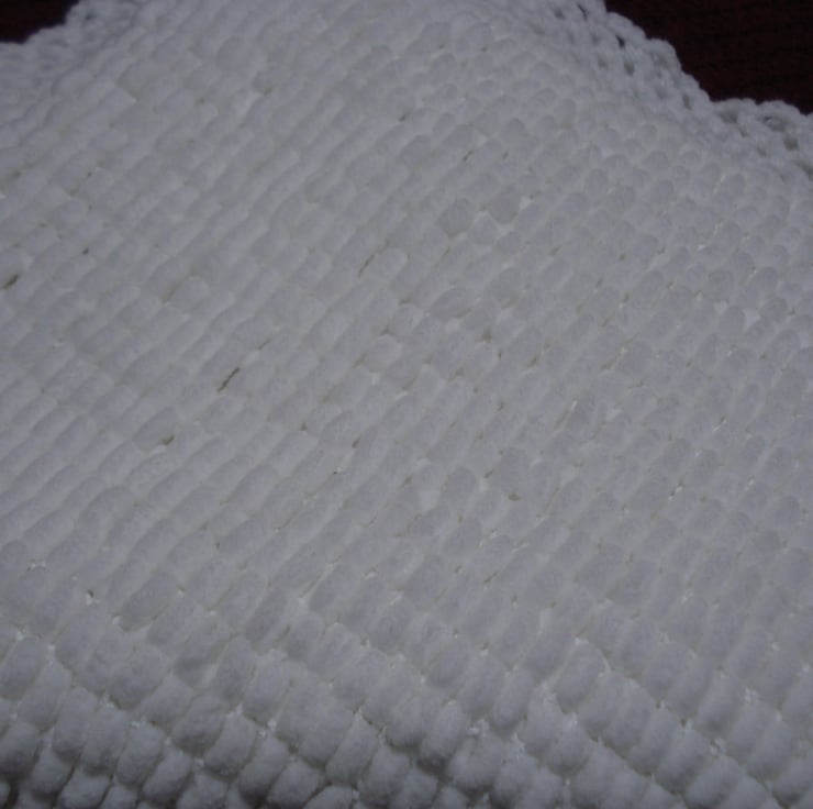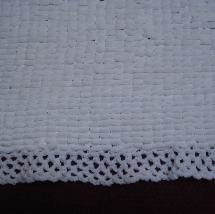 This is a lovely thick and very soft car seat blanket to drape over baby. The yarn in the centre is a small pom pom yarn and edge is finished in a crochet pattern of white double knit yarn. The blanket weighs 262gms but feels light and cosy. It would make a lovely gift for a new born baby.