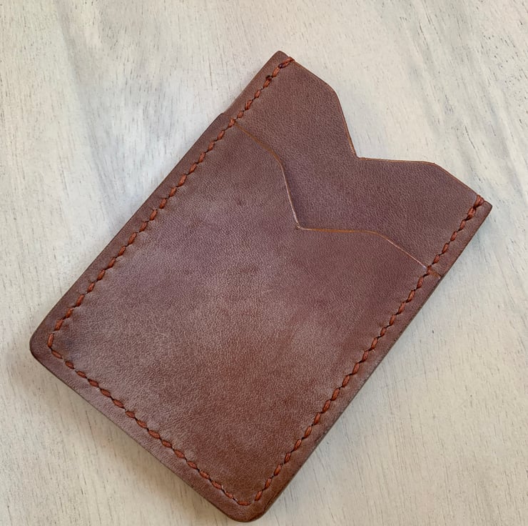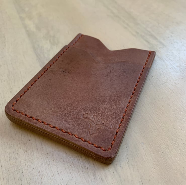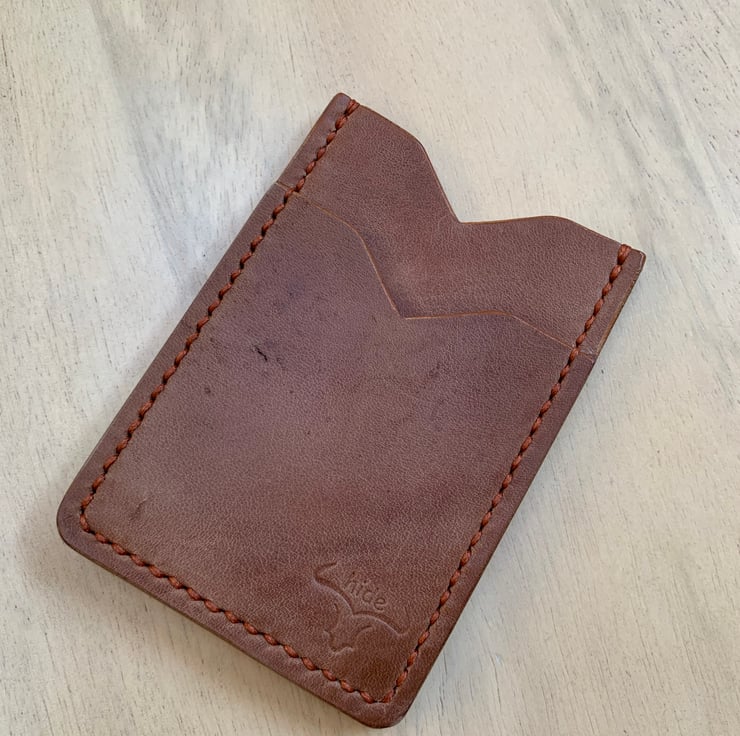 The card wallet is hand sewn using traditional saddle stitching with a slam waxed thread in rust for superior strength and detail. The edges are burnished to seal the leather so it retains its natural oils and won’t dry out.