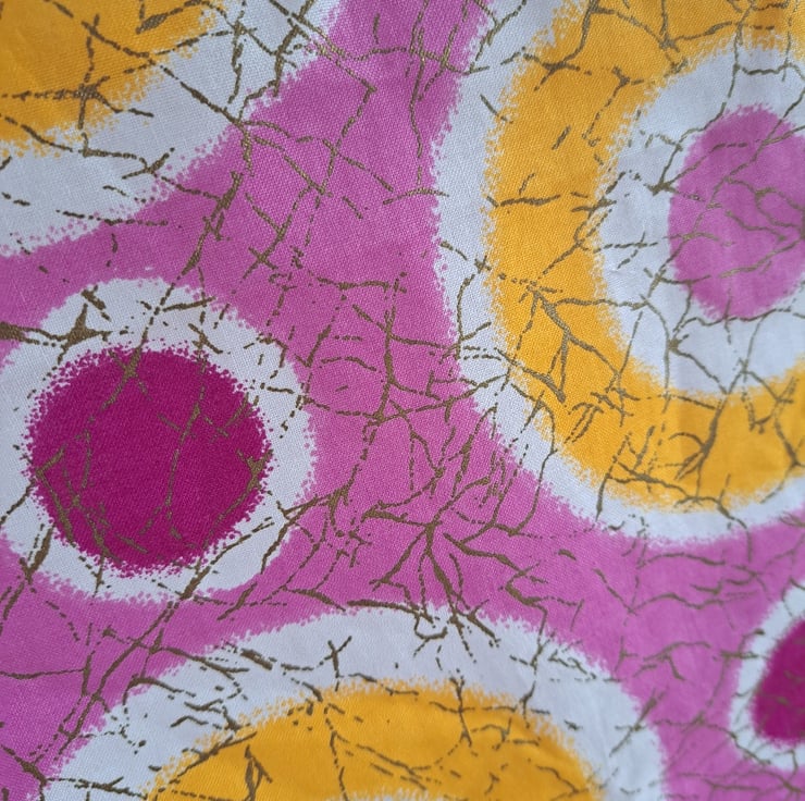 Where to start with this very unusual length of rescued fabric? It's substantial - a good thick craft weight cotton with a smooth surface. The design is pretty out there: a pink background with darker pink and yellow circles and a network of overlaid gold "veins" throughout. It might well be wax print, although there are no selvage marks. Please note there are some faint needle holes where I unpicked a couple of puzzling hems.
