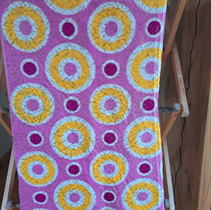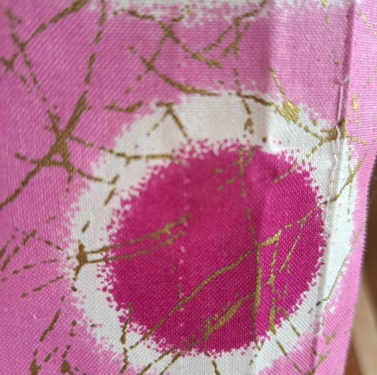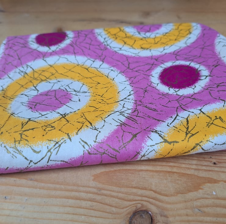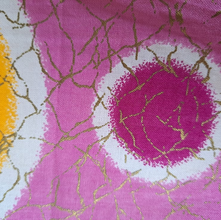 Where to start with this very unusual length of rescued fabric? It's substantial - a good thick craft weight cotton with a smooth surface. The design is pretty out there: a pink background with darker pink and yellow circles and a network of overlaid gold "veins" throughout. It might well be wax print, although there are no selvage marks. Please note there are some faint needle holes where I unpicked a couple of puzzling hems.