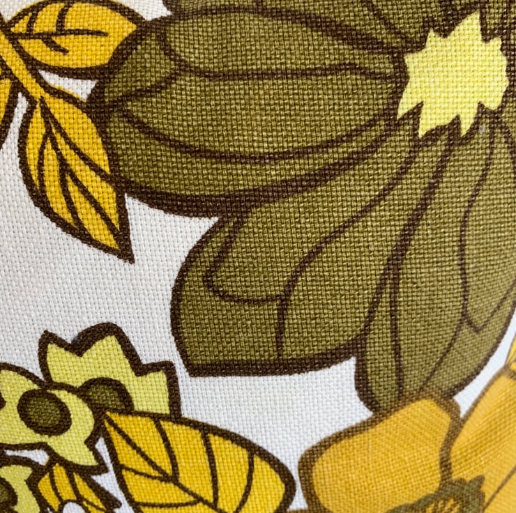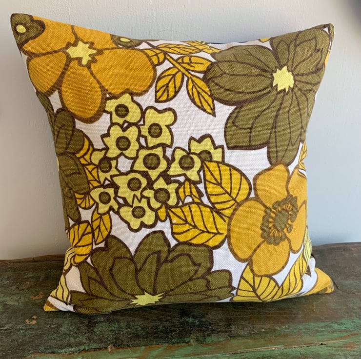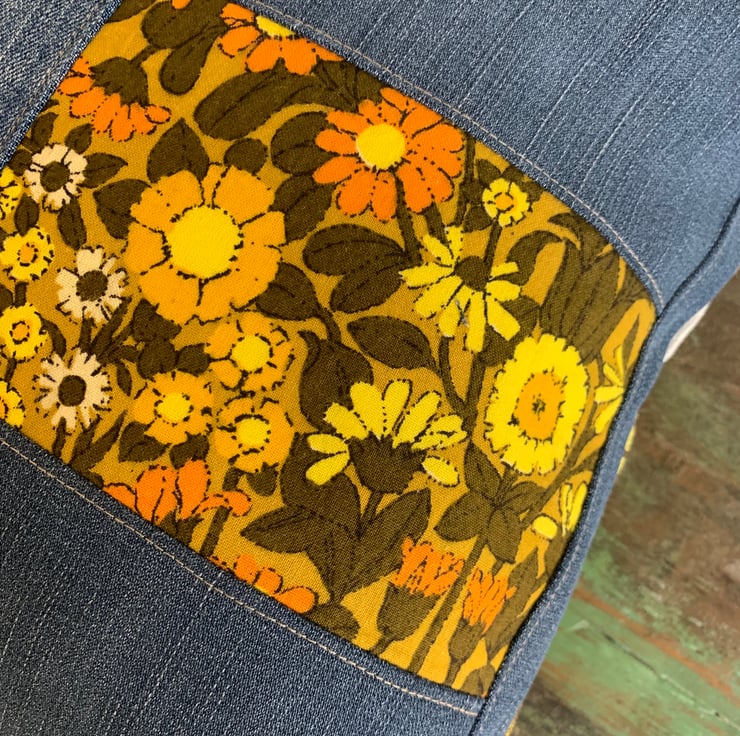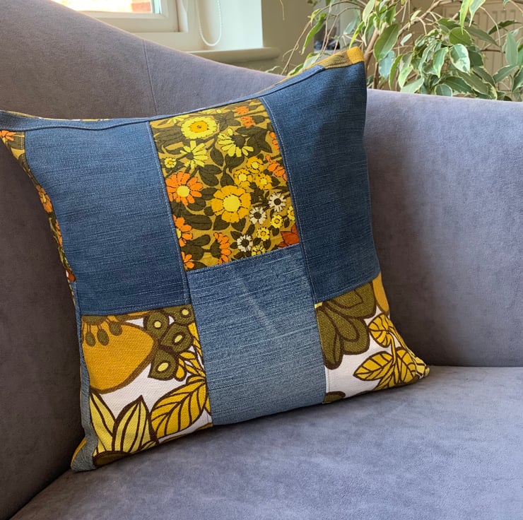 Bright, one of a kind cushion cover made from reclaimed fabric from 2 different retro curtains and some jeans. The large floral is from 1970s vintage Marks and Spencer curtains and the smaller floral is Daisy Chain by Jonelle duracolour.