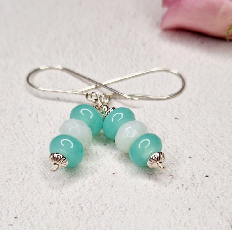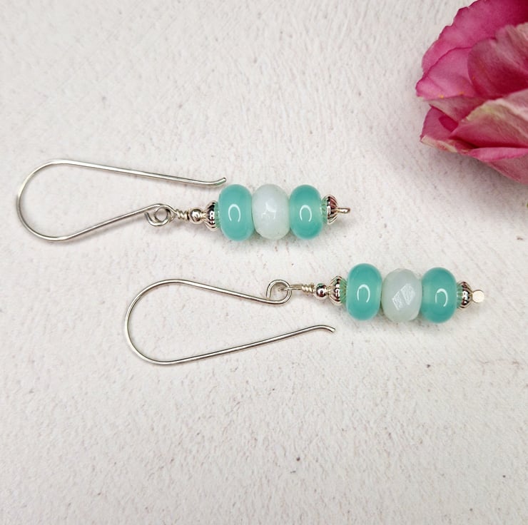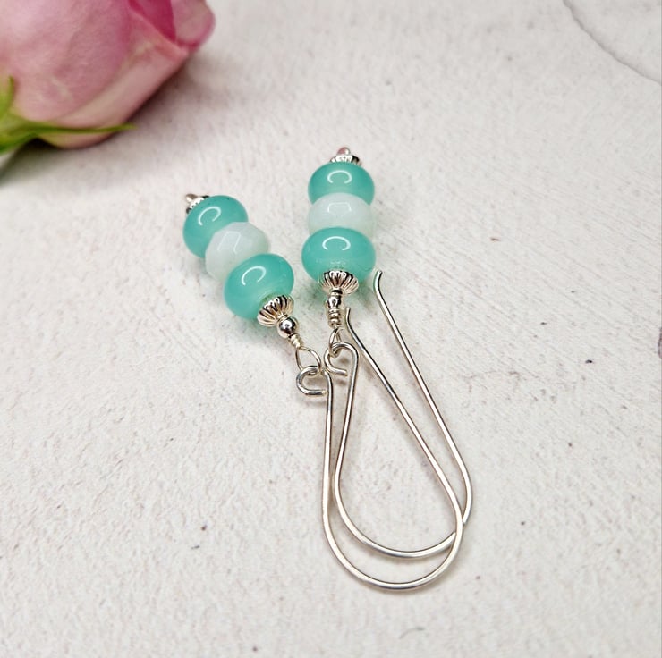 The lampwork glass beads are a consistent even pale teal colour, the amazonite is a paler teal colour. The beads are rondelle shaped and about 8 x 6 mm, together with corrugated saucer silver beads.