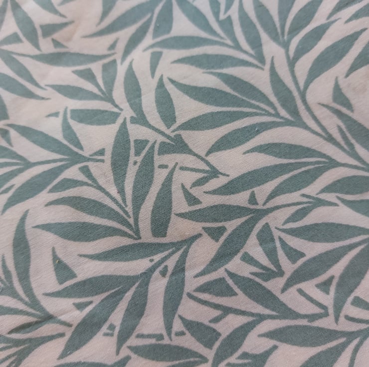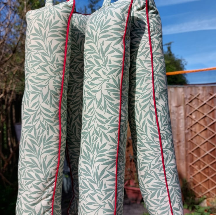 Handmade boot stuffer made with 100% cotton willow pattern fabric in green and cream with a red piping, filled with a polyester toy stuffing. Item measures 18inches long and is 5 inches wide. Made to keep your boots upright when not in use saving the shape at the ankles.