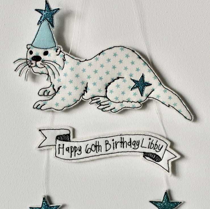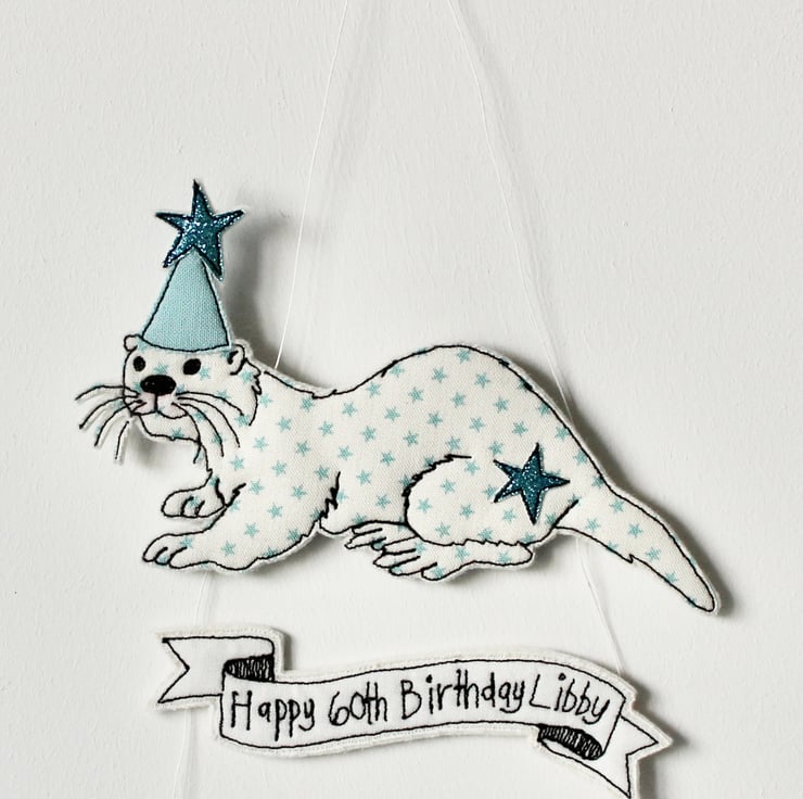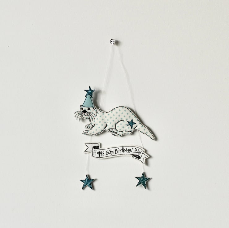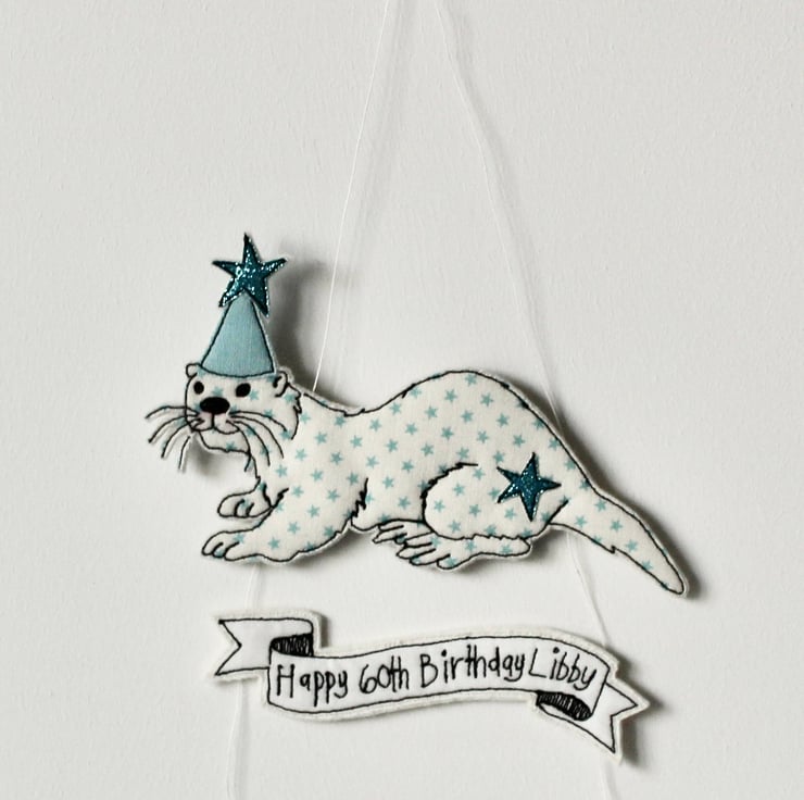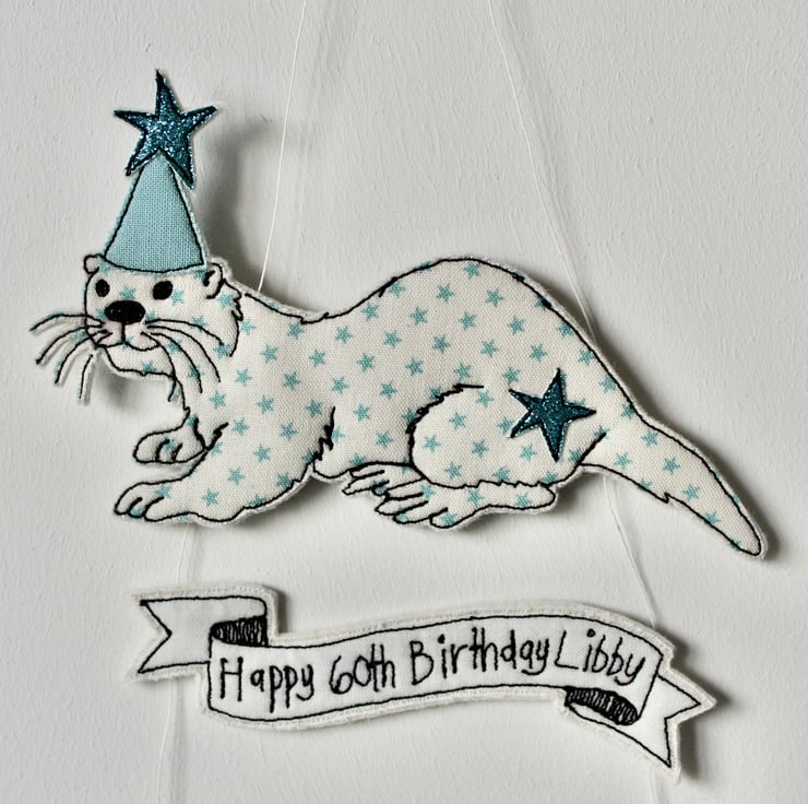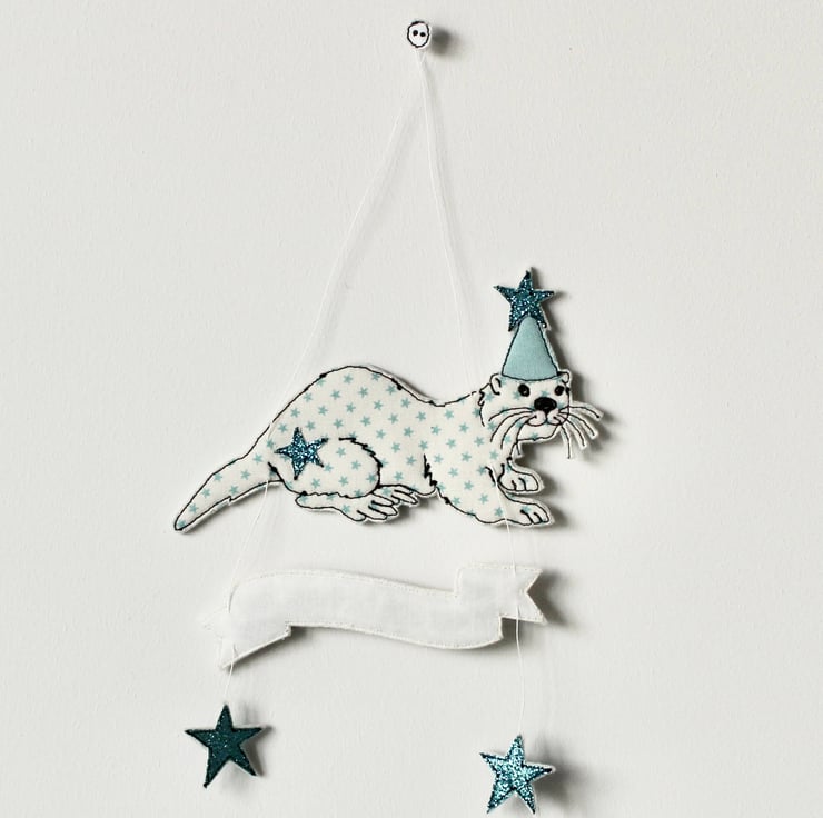 Sea Otter measures approximately 9cm by 12cm with the sewn banner measuring 3cm by 10cm and the glittery stars 3cm by 3cm.
