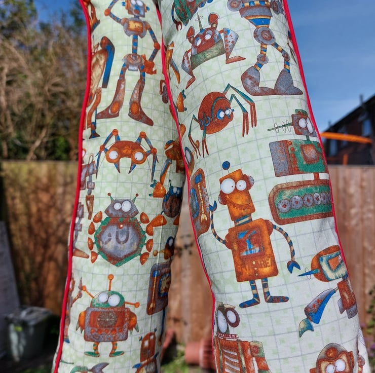 Handmade boot stuffer made with 100% cotton robot pattern fabric on a green background with a red piping, filled with a polyester toy stuffing. Item measures 18inches long and is 5 inches wide. Made to keep your boots upright when not in use saving the shape at the ankles.
