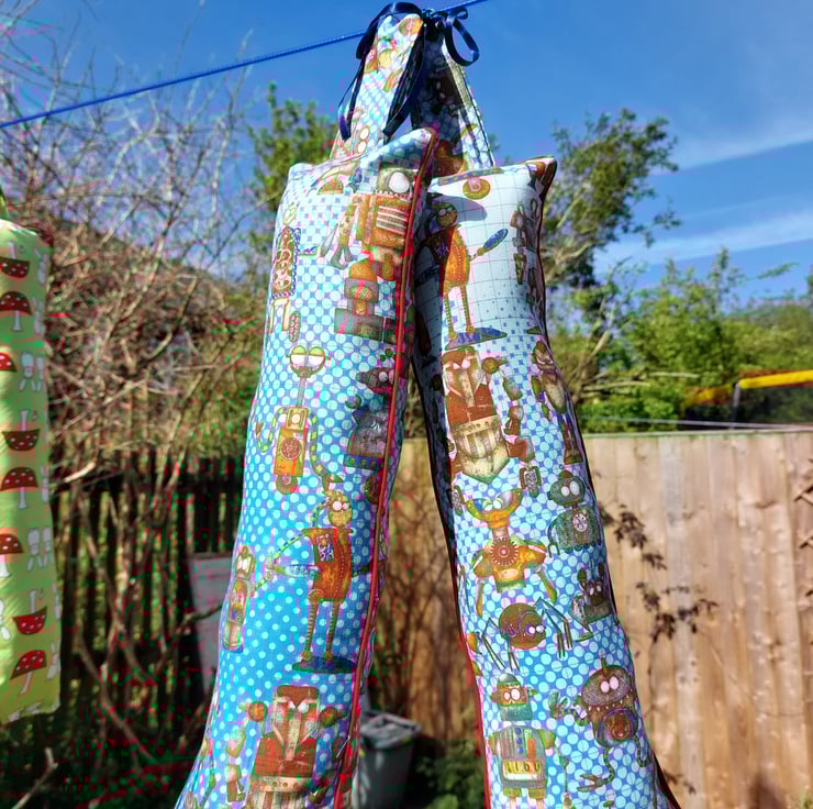 Handmade boot stuffer made with 100% cotton robot pattern fabric on a blue background with a red piping, filled with a polyester toy stuffing. Item measures 18inches long and is 5 inches wide. Made to keep your boots upright when not in use saving the shape at the ankles.