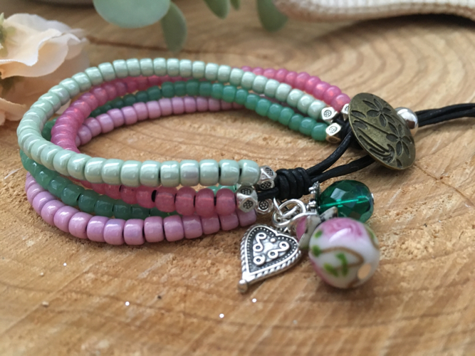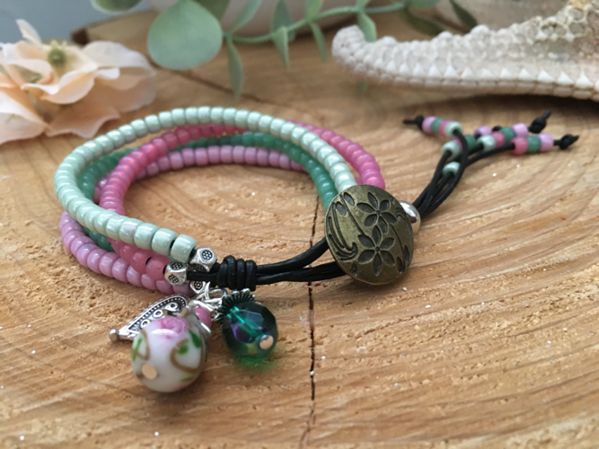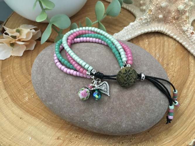 The bracelet is secured using a pretty antique copper tone button embossed with a heart. A silver tone slider bead has been added making the bracelet adjustable and should fit a wrist between 6 and 7.5 inches