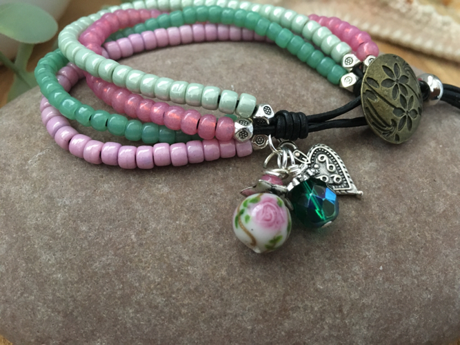 Very easy and comfortable to wear , the perfect compliment to jeans and t shirt. An assortment of Glass Picasso beads have been strung on 4 strands of soft Italian 1 mm black leather. Pretty Tibetan spacer beads have been added at each.