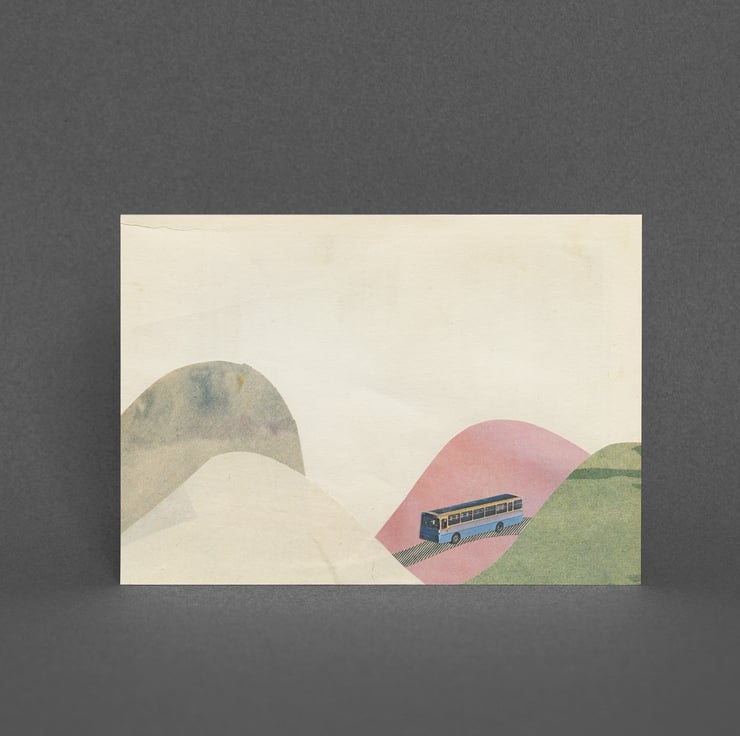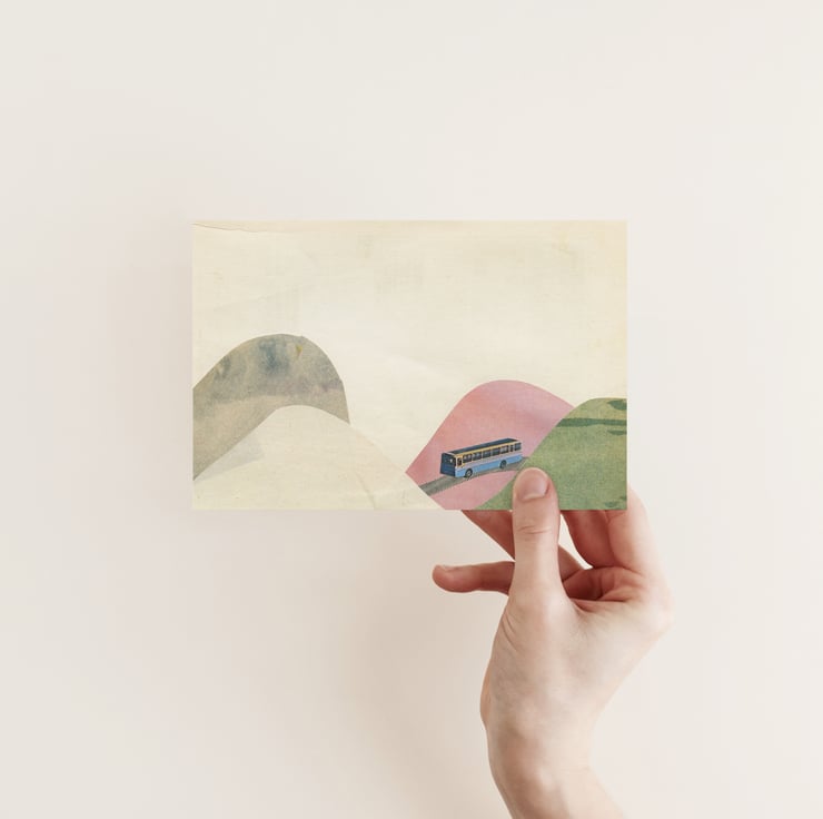 A sweet card featuring a little bus winding it's way through the valleys.