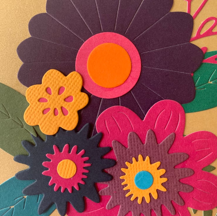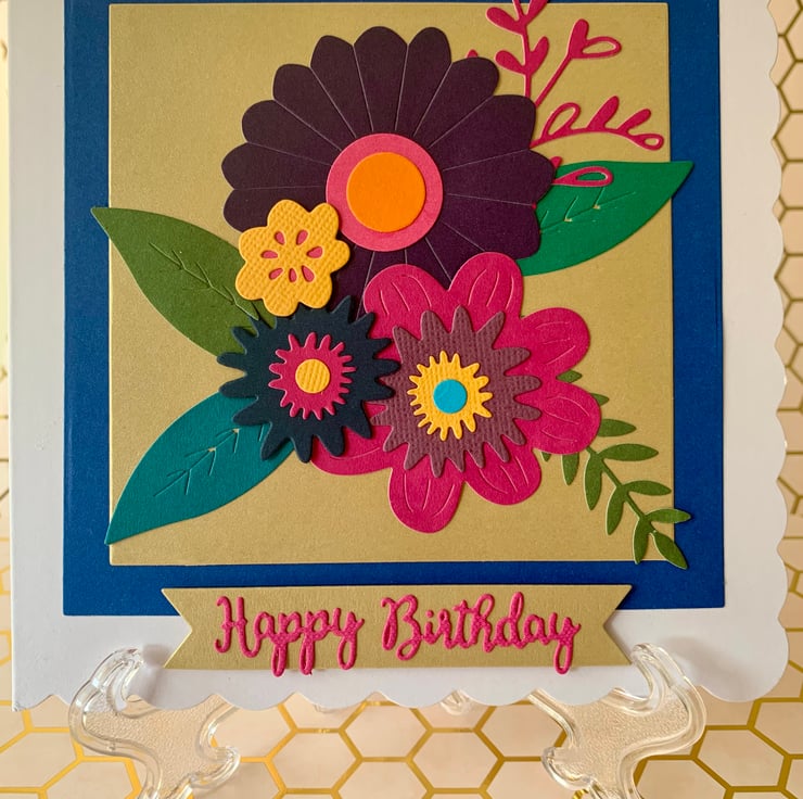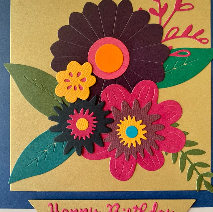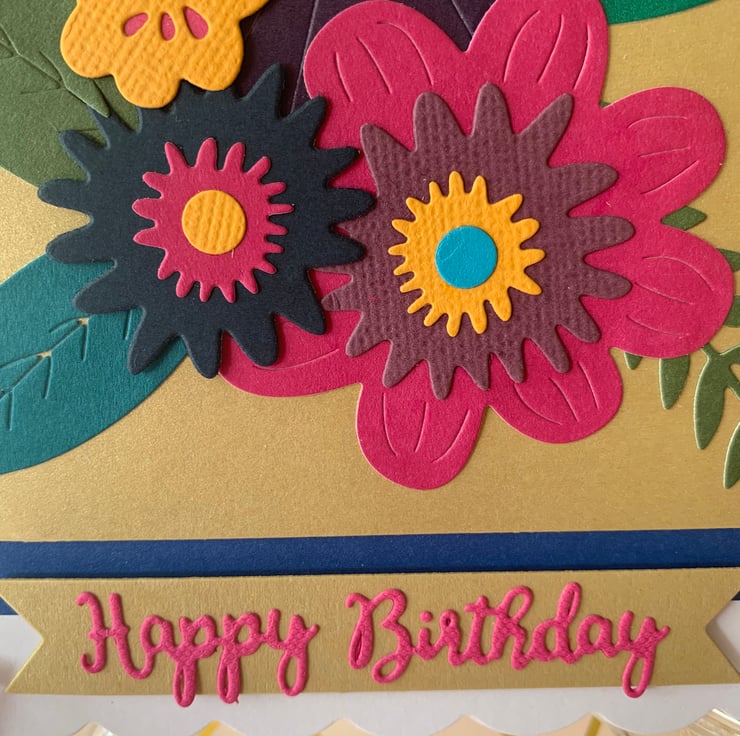 This is a pretty, floral Happy Birthday card, made using die cut pieces, all of which are set onto a scalloped edged white card! measuring approximately 15 x 15cm, 300gsm.