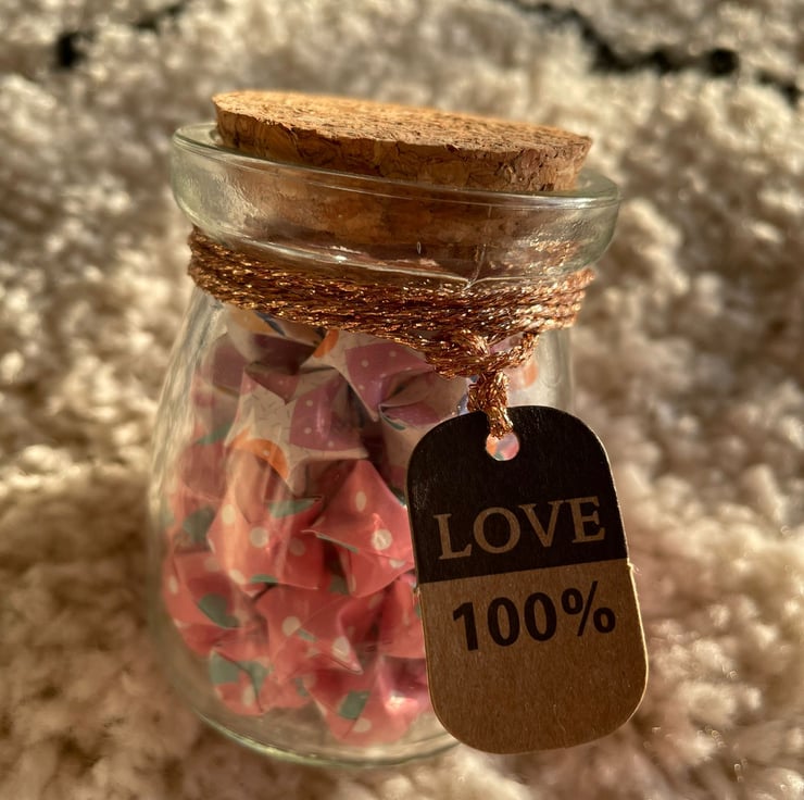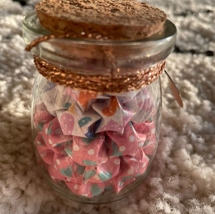 Within the jar, you'll discover a captivating collection of handmade folded lucky stars. The stars are meticulously crafted, showcasing the same level of care and attention that goes into preparing a real strawberries and cream pot.