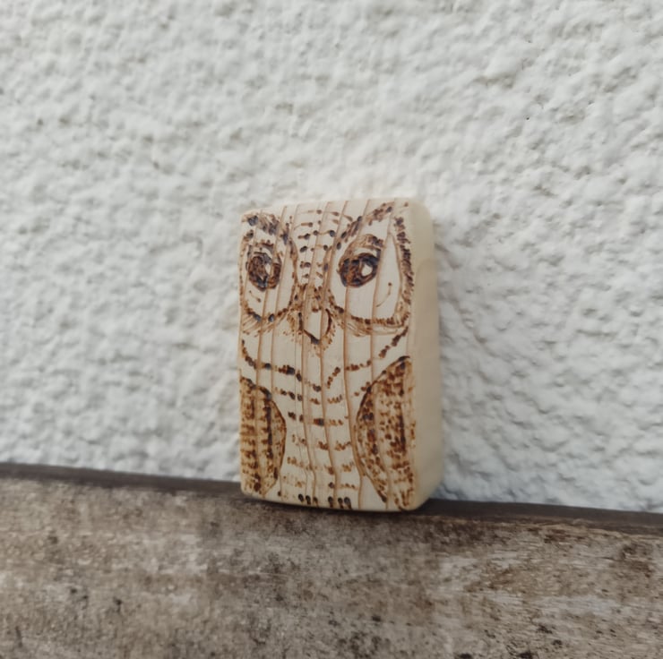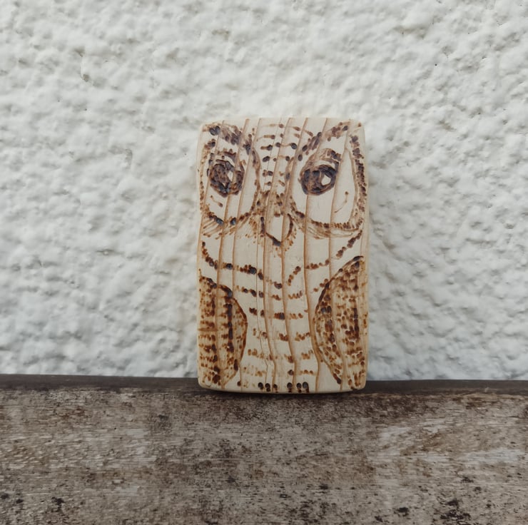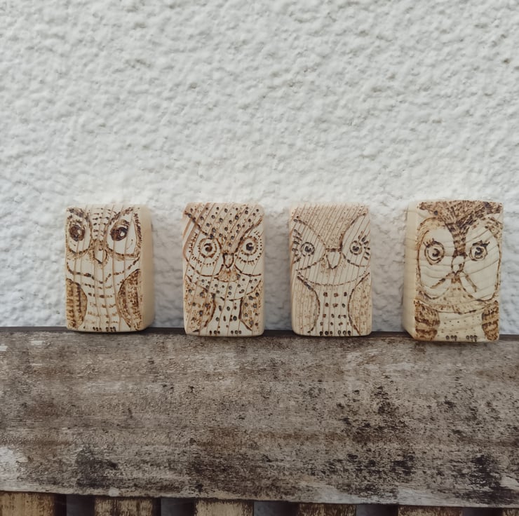 A little owl made from a small wood offcut, sanded smooth, pyrography design drawn on, then sealed with wax and buffed. Height 5cm approximately. Each is individually designed and drawn by hand.