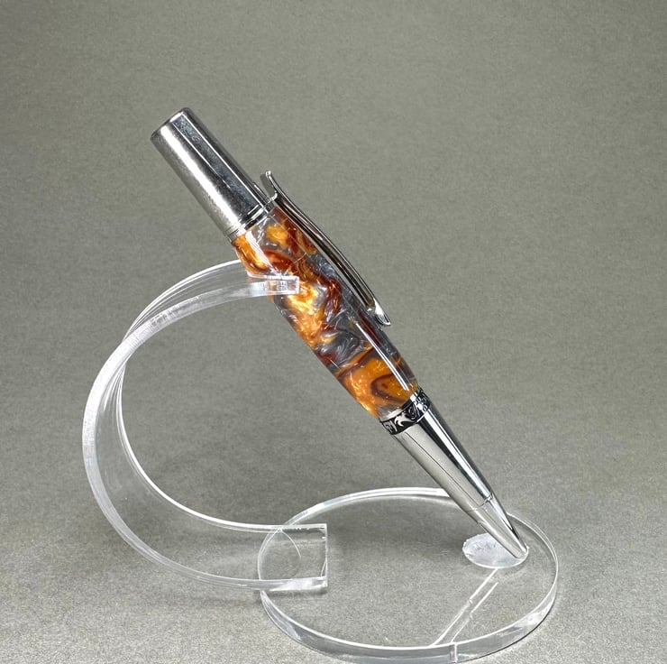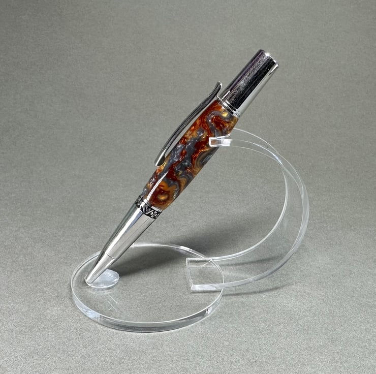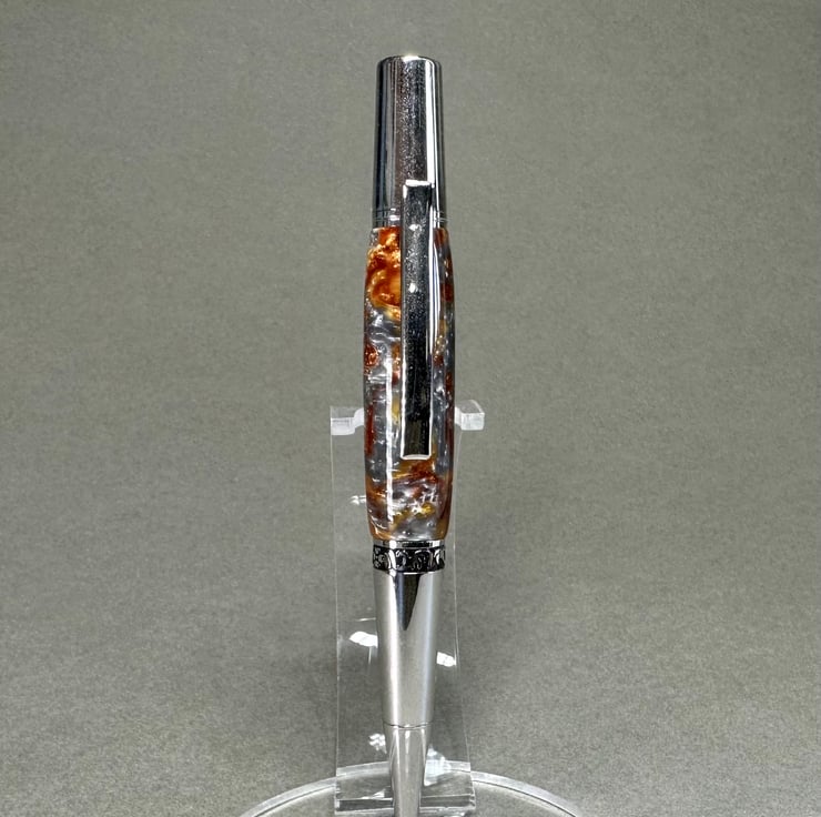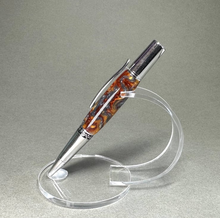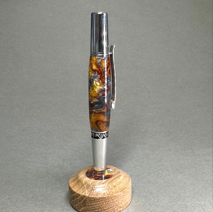 A beautiful unusual molten metal effect pen. Twist grip with refills readily available on the high street. Would make a lovely retirement ,anniversary ,graduation or treat yourself pen. Presented with a wood turned stand and gift box.