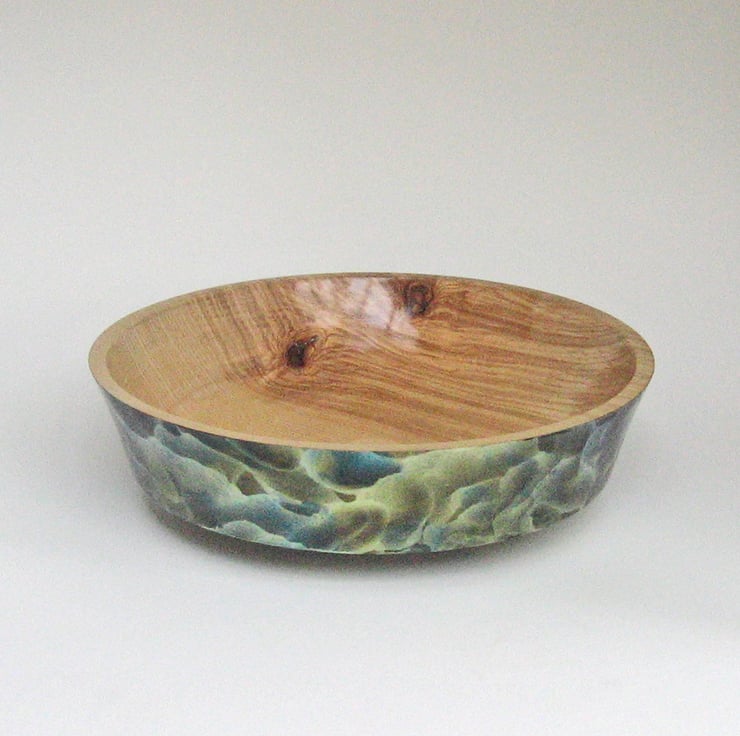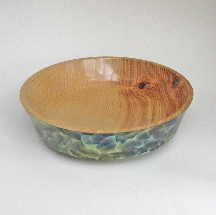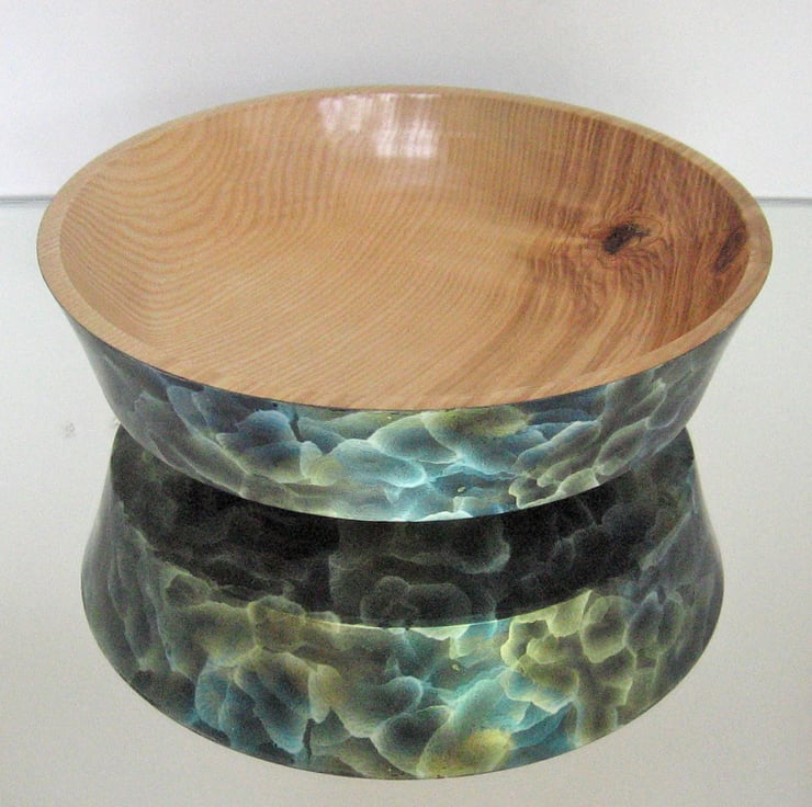 I turned this generously sized bowl from a lovely piece of Ash. After applying a sanding sealed and finishing to a fine smooth surface I applied an interesting iridescent finish that contrasts with the natural grain of the bowls interior. Ultimately I applied a hard wearing lacquer to the piece that just needs a damp cloth to keep clean.