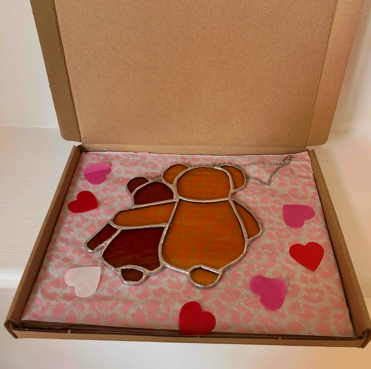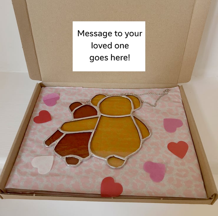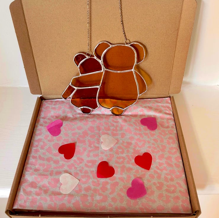 Imagine ...... cute hugs, reassurance and designed to be hung anywhere that sunlight illuminates the glass. All three are embodied in this unique handmade tiffany style stained glass bear hug.