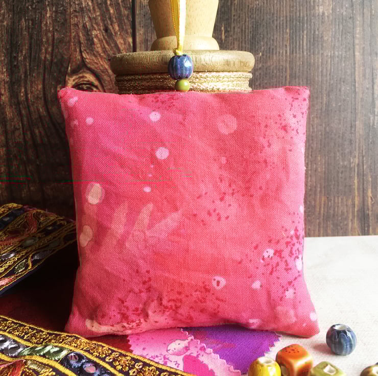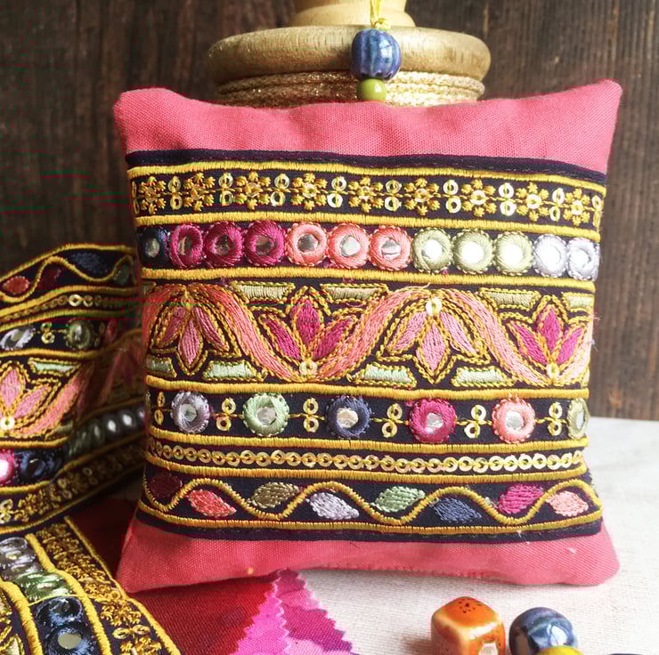 The lavender bag has been decorated with a section of embroidered Indian trim which I've hand stitched onto cotton fabric. I've used batik fabric for the reverse and added a couple of ceramic beads to the hanging loop.