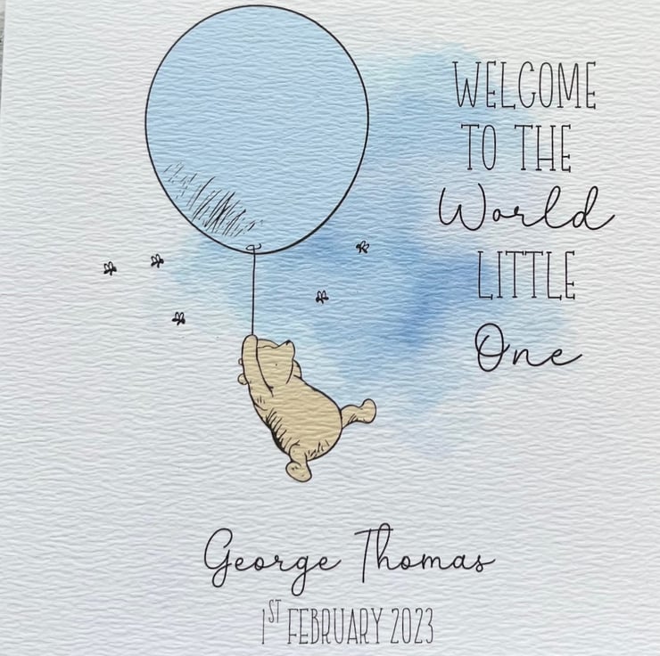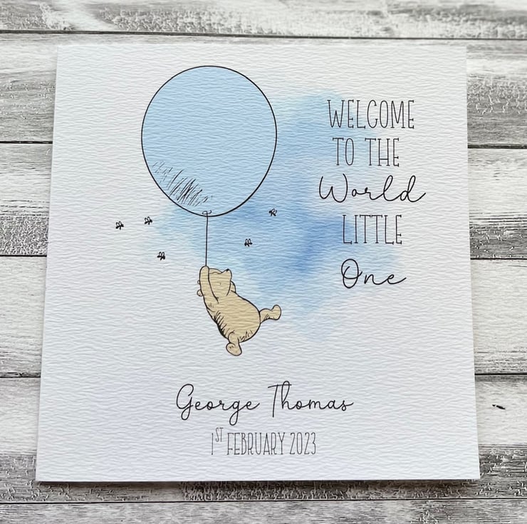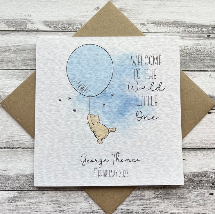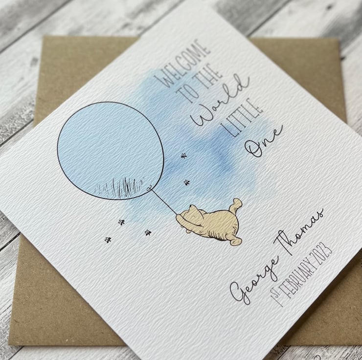 This personalised Winnie the Pooh baby boy card is perfect for new parents.
