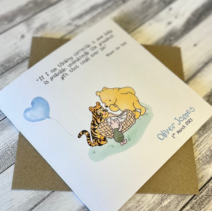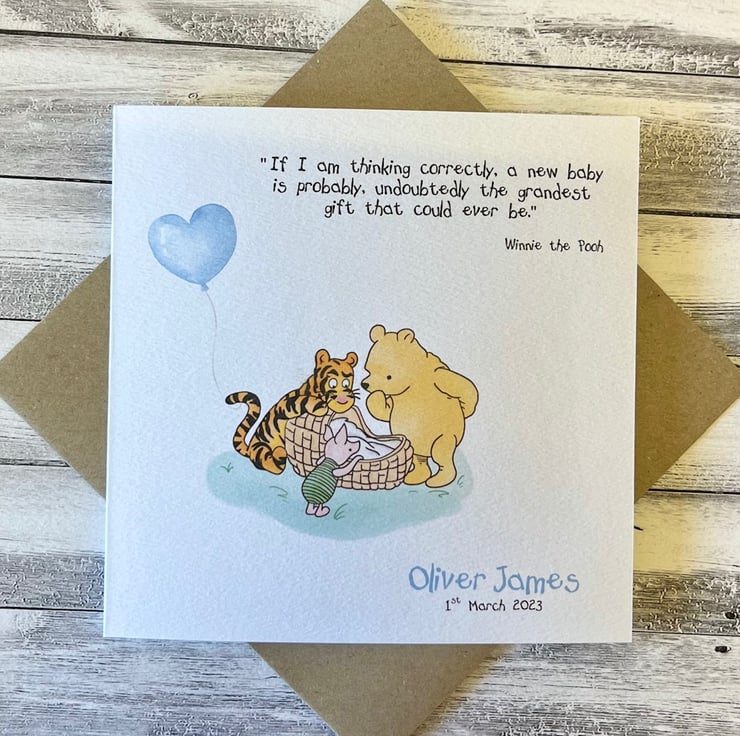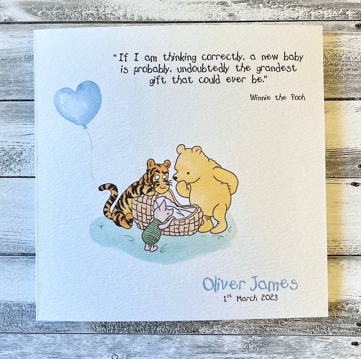 This personalised Winnie the Pooh baby boy card is perfect for new parents.