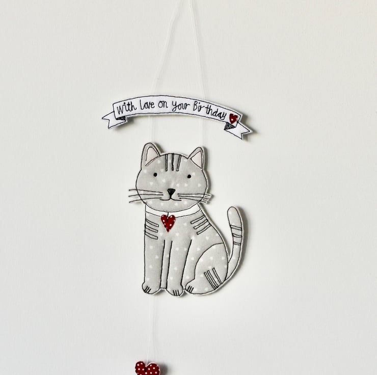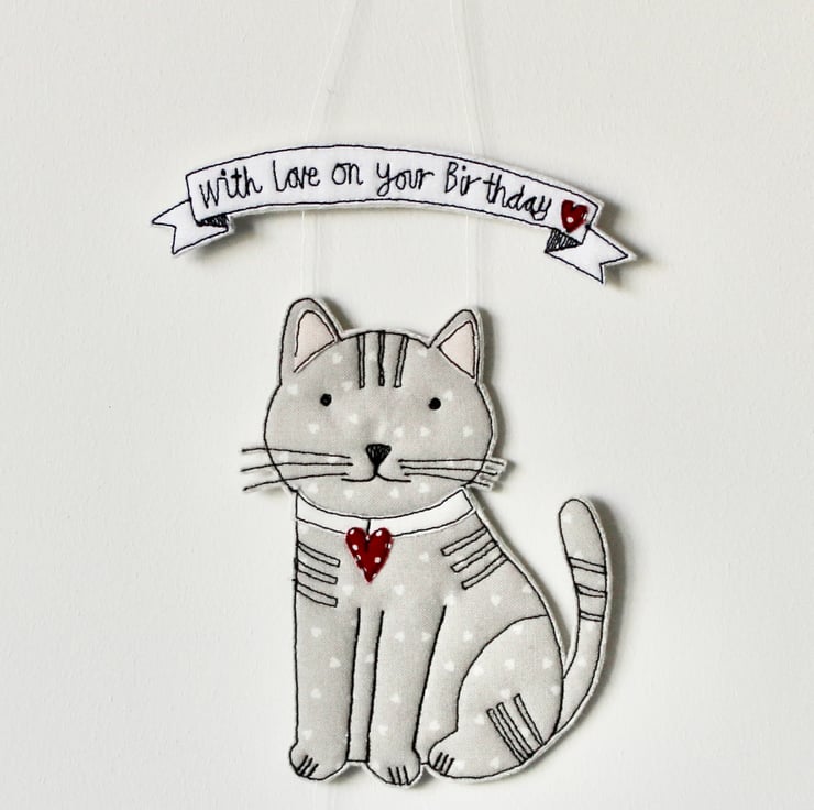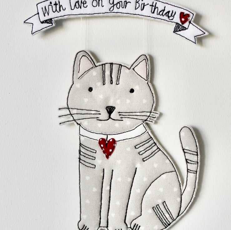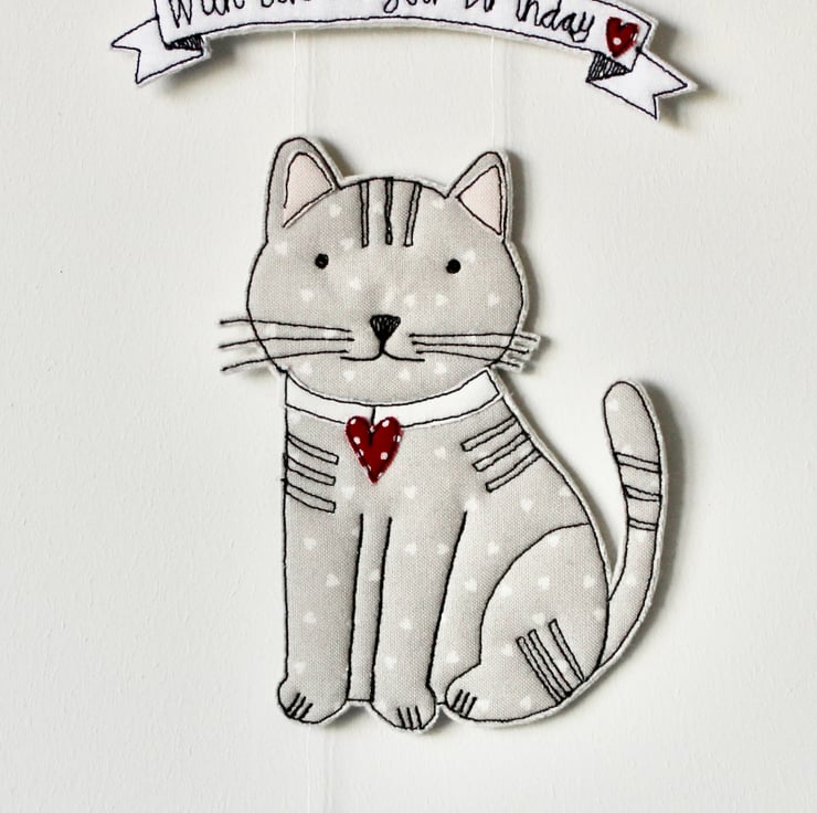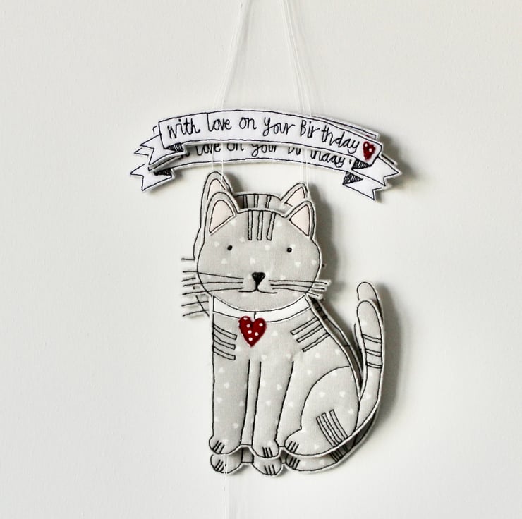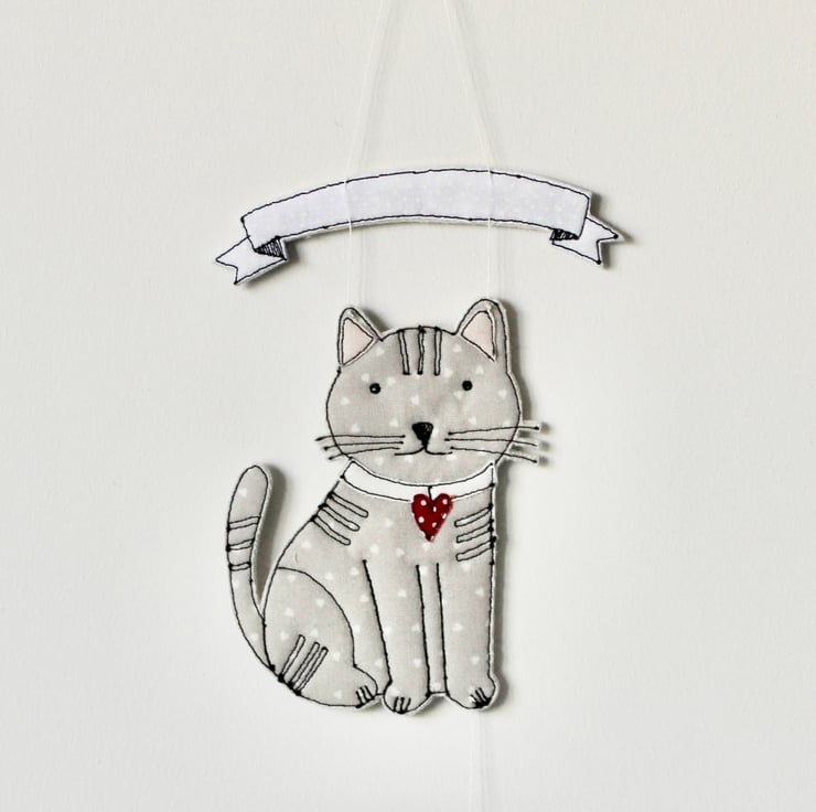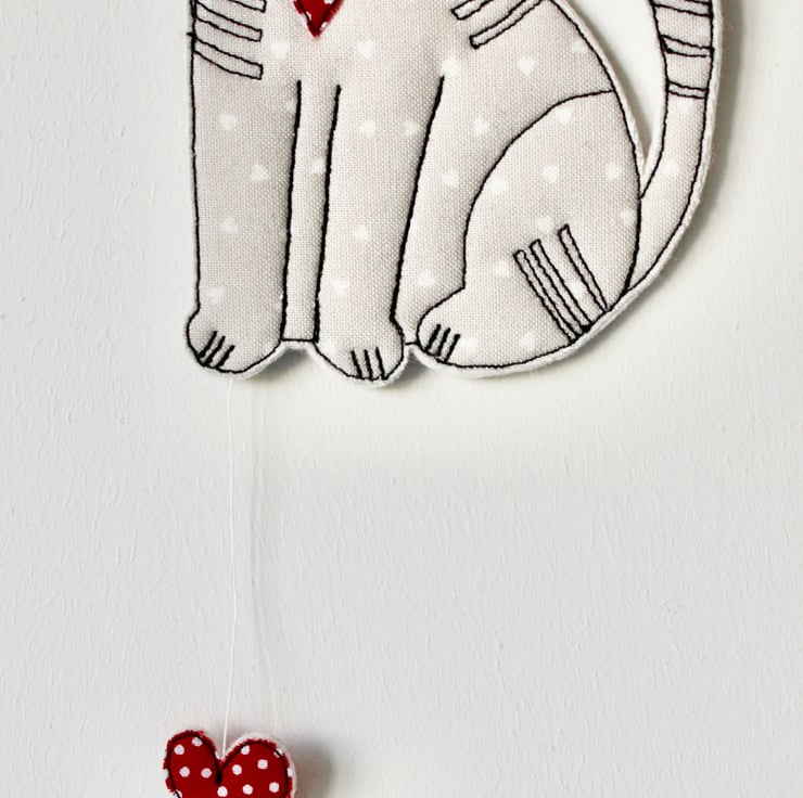 Smiling cat measures approximately 12cm by 9cm with the sewn banner measuring 4cm by 12cm and the red spotty heart 2cm by 2cm.