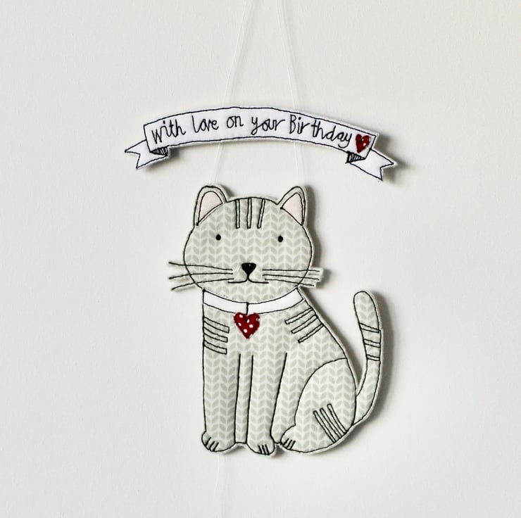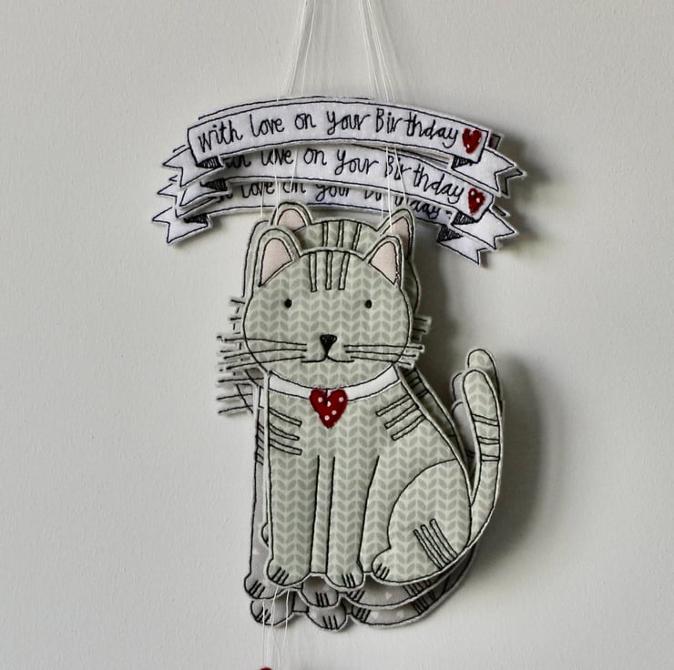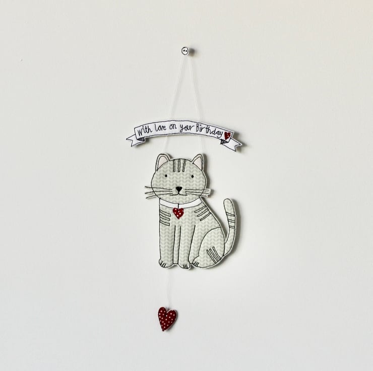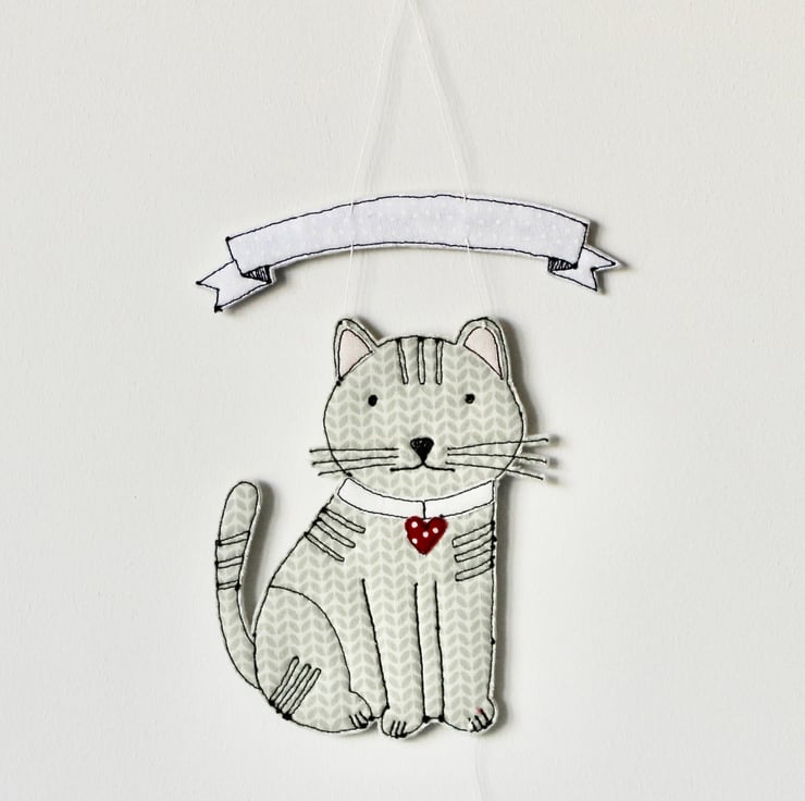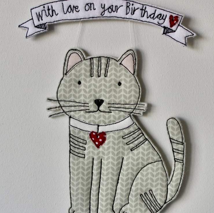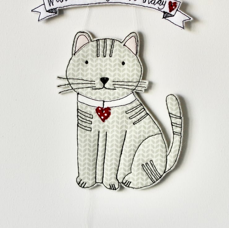 Smiling cat measures approximately 12cm by 9cm with the sewn banner measuring 4cm by 12cm and the red spotty heart 2cm by 2cm.