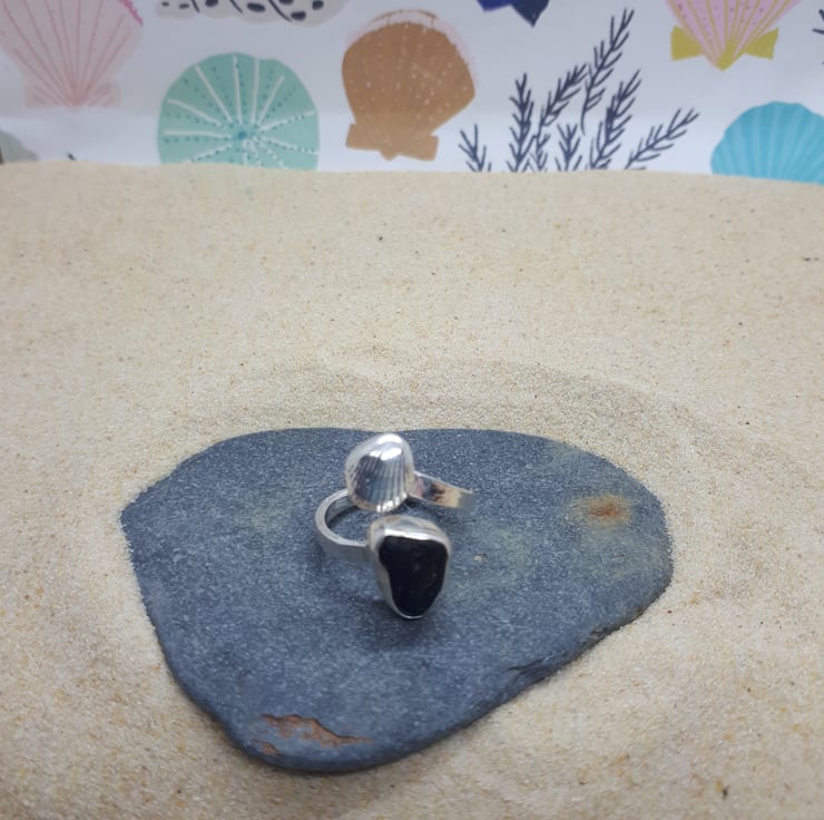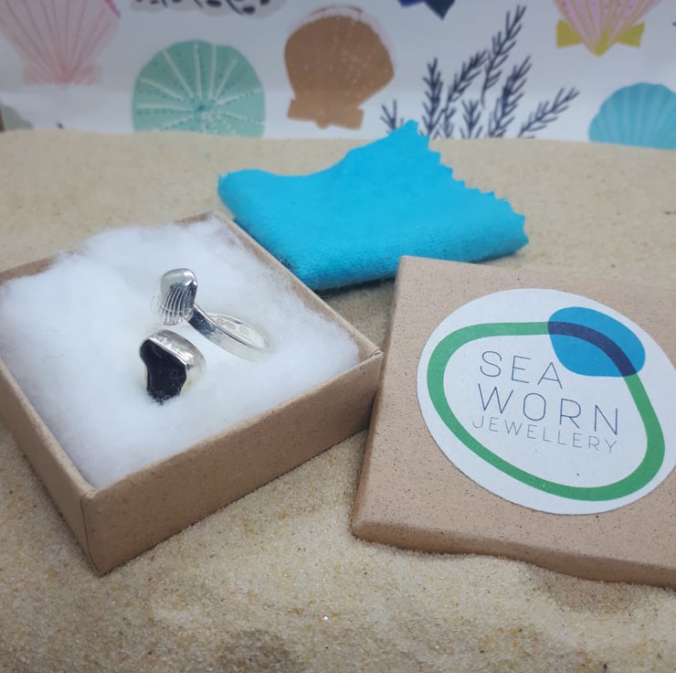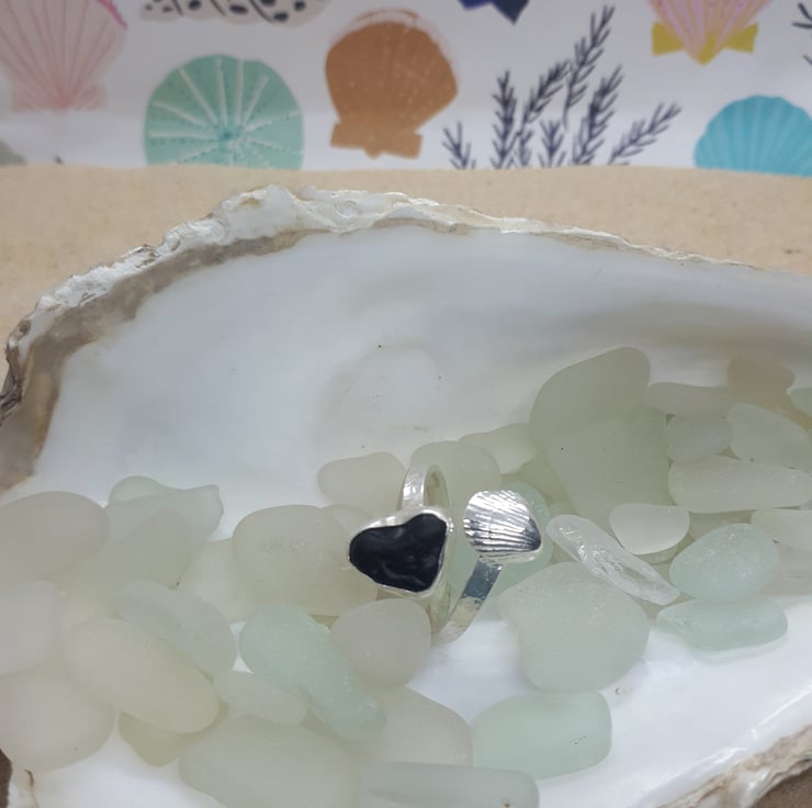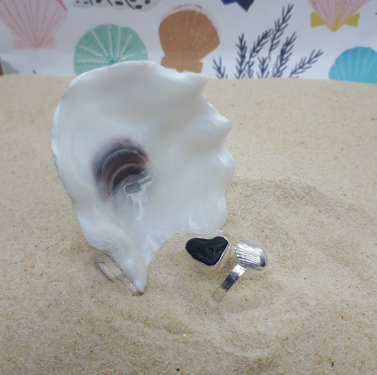 A piece of genuine UK sea glass (pirate black/dark Olive green) set in fine silver on an adjustable sterling silver hammered band.