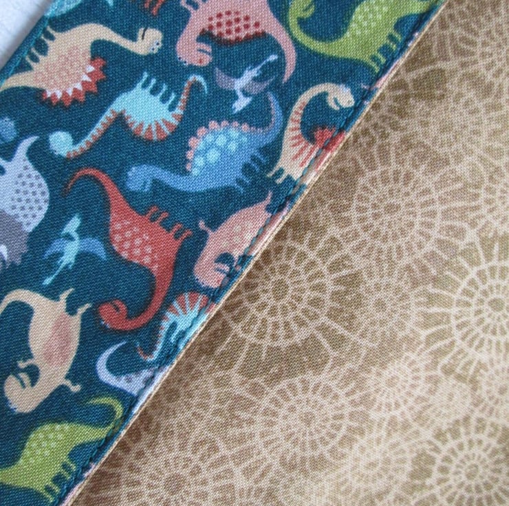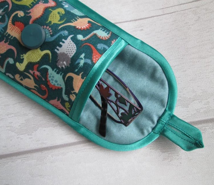 The glasses/phone case is lined with duck egg (or possibly pterodactyl egg) blue cotton. It is lightly padded and finished with jade green bias binding and a loop and button fastening. It could also be used as a small pencil case. It will take most pairs of glasses and phones up to 16 cm x 7 cm x 1 cm. (Glasses and phone shown for illustrative purposes and not included.